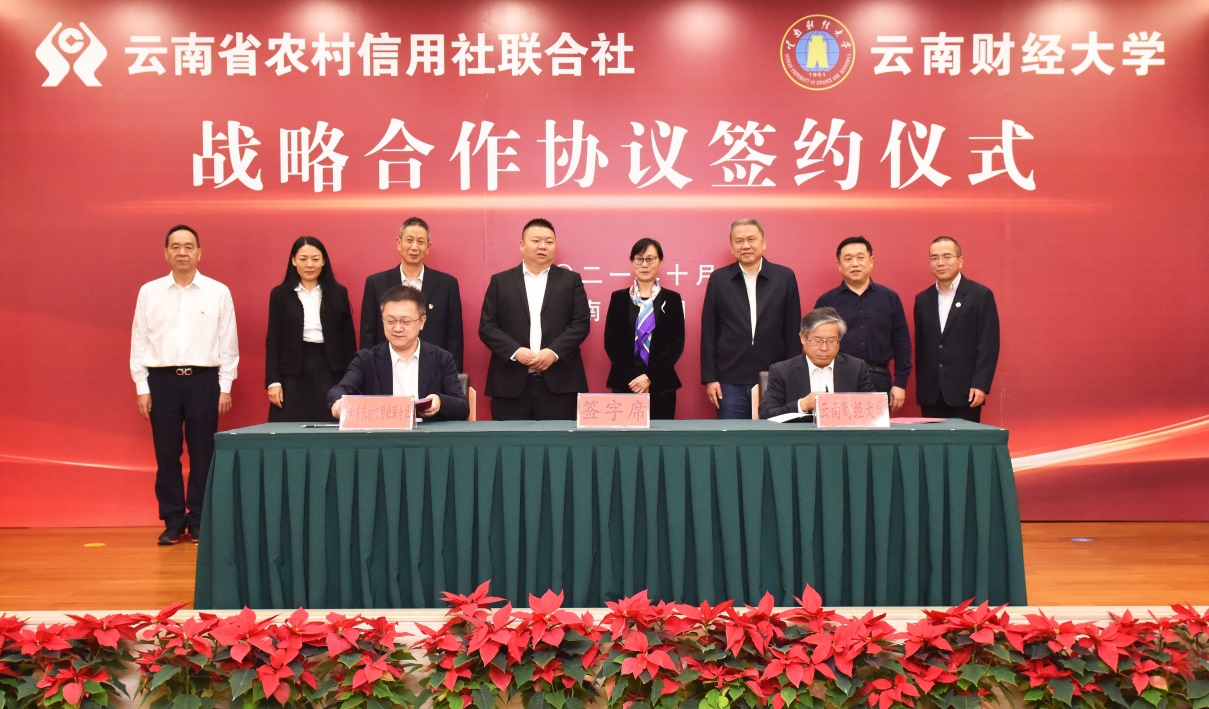 10月12日下午,学校与云南省农村信用社联合社签署战略合作协议。省联社党委书记、理事长倪立,党委委员、副主任李梅、孔祥丹,主任助理杨银彪;学校党委书记王建颖,党委委员、副校长王敏出席。校党委副书记、校长伏润民与省联社党委副书记、主任边庆分别代表双方签署战略合作协议。