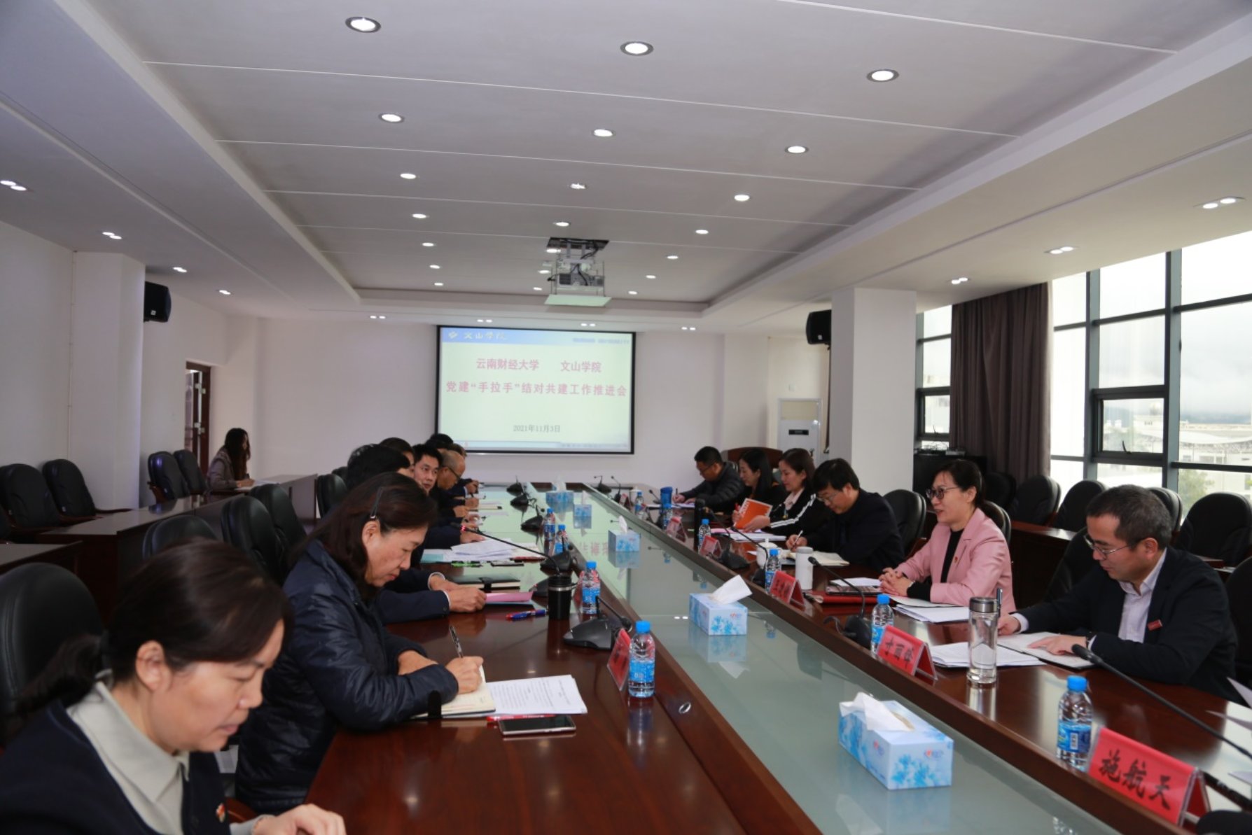 11月3日上午,王建颖一行来到文山学院,参加bat365在线中国官网登录入口、文山学院党建“手拉手”结对共建推进会。文山学院党委书记李炳泽主持会议并致辞,党委副书记杨汝华,党委委员、纪委书记杨萍及相关部门负责人参加推进会。双方就深入开展联学、联建、联动相关活动及师资队伍、专业课程、科学研究、人才培养、新校区建设等方面结对共建工作进行了商讨。