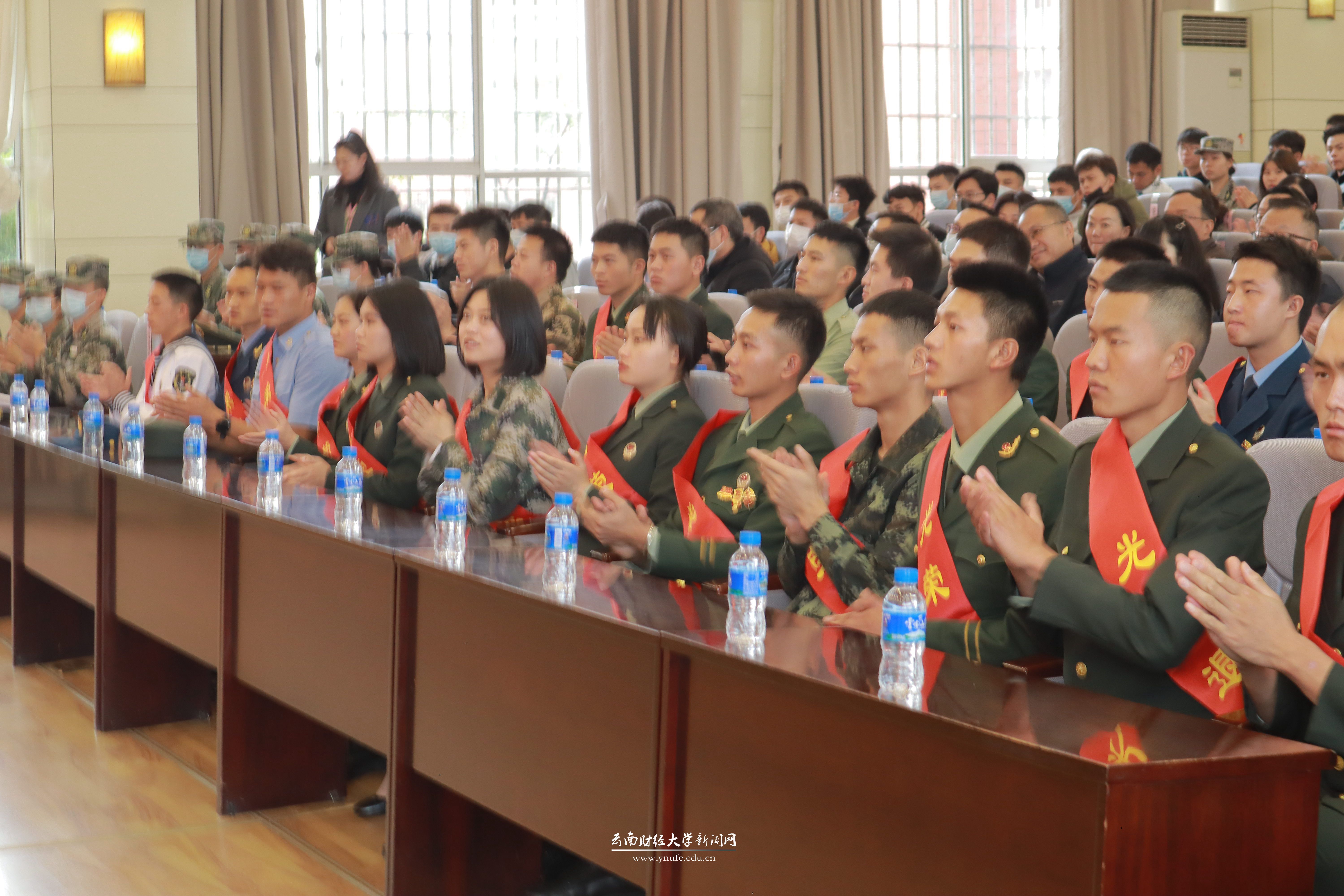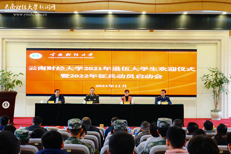 11月12日下午,bat365在线中国官网登录入口2021年退伍大学生欢迎仪式暨2022年征兵入伍动员启动会在凌云楼国际学术报告厅举行。云南省政府征兵办副主任、云南省军区动员局副局长李宁明,云南省军区动员局参谋邓坤,五华区武装部部长任鹏飞,学校党委书记王建颖,学校办公室、宣传部、学生处(学工部、武装部)、教务处、校团委、招生与职业发展中心相关负责人,各学院党委书记、学生管理科科长,2021年退伍复学全体学生,各学院学生代表及学校国防后备连学生代表参加会议。会议由学校党委副书记桂正华主持。