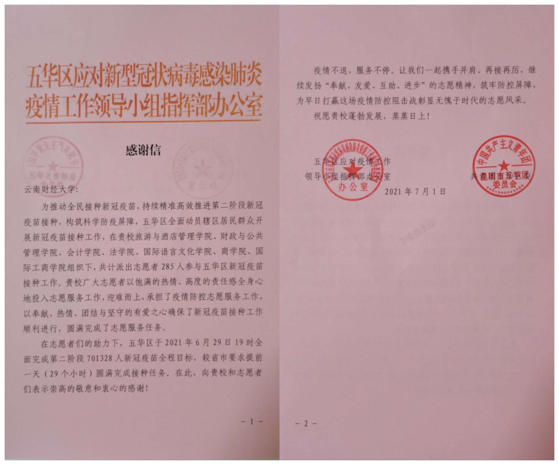 经过大家的共同努力,五华区于2021年6月29日19时全面完成第二阶段701328人新冠疫苗全程接种目标,较省市要求提前一天(29个小时)圆满完成接种任务。五华区应对疫情工作领导小组指挥部办公室向bat365官网志愿者表达了感谢。