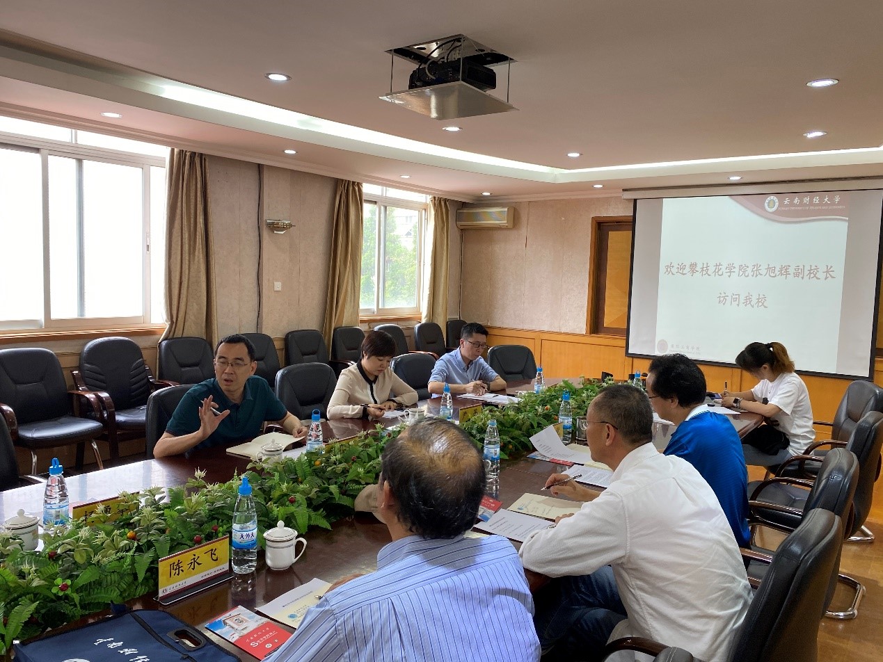 7月22日下午,四川攀枝花学院副校长张旭辉、经管学院院长杨勇攀、规划处副处长李博,科研处副处长尹茜一行到访bat365官网。学校研究生处教学督导组组长兰天,经济学院党委书记陈永飞,城市与环境学院院长刘春学,国际工商学院院长王荣党、副院长尹豪等在国际工商学院会议室与来宾举行会谈,就教育合作等多个事项进行了深入有效的沟通。会后,副校长王敏、研究生处处长刘富华与攀枝花学院一行进行了交流。