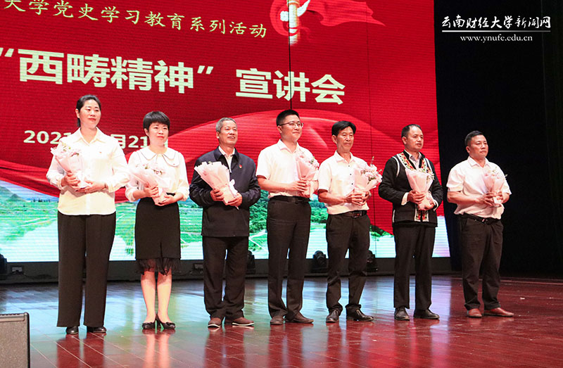 宣讲结束,学生代表向宣讲团成员献花,与会师生们用掌声向宣讲团成员致以最崇高的敬意。会前,师生党员们一起观看了“西畴精神”宣传片《沧桑巨变是干出来的》。宣讲会由学校党委委员、宣传部部长张文华主持。文山州委宣传部副部长、州政府新闻办主任蒋天云主持宣讲环节。