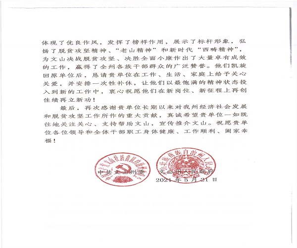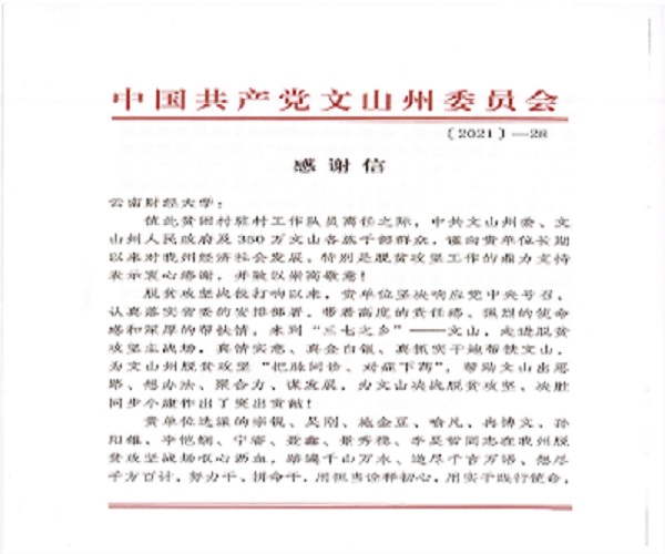 在国家全面建成小康社会,坚持实施乡村振兴战略之际,学校收到来自中共文山州委 文山州人民政府的感谢信。信中感谢bat365官网党委在脱贫攻坚战役打响以来,坚决响应党中央号召,认真落实省委的安排部署,带着高度的责任感、强烈的使命感和深厚的帮扶情,走到脱贫攻坚主战场,真情实意、真金白银、真抓实干地帮扶文山出思路、想办法、聚合力、谋发展,为文山决战脱贫攻坚、决胜同步小康作出了突出贡献。同时,感谢bat365官网选派的驻村工作队在文山州脱贫攻坚战场呕心沥血,努力干、拼命干,用担当诠释初心,用实干践行使命,为文山决战脱贫攻坚、决胜全面小康作出了卓有成效的工作。