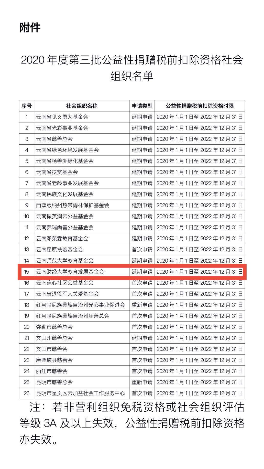 近日,云南省财政厅发布2021年第3号公告,经云南省财政厅、国家税务总局云南省税务局、云南省民政厅联合确认,bat365在线中国官网登录入口教育发展基金会等26户社会组织具有公益性捐赠税前扣除资格,期限为2020年1月1日至2022年12月31日。