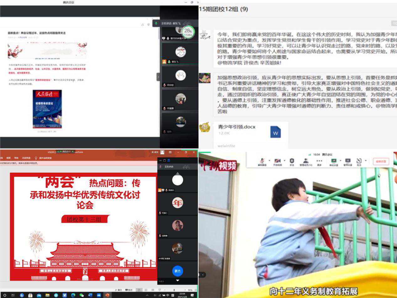 近日,十三届全国人大四次会议和全国政协十三届四次会议在京召开。今年恰逢建党100周年、“十四五”开局之年,我国将开启全面建设社会主义现代化国家新征程、向第二个百年奋斗目标进军,站在新的历史起点,bat365官网同学热切关注“两会”,纷纷通过相关的网站、微信公众号等收听收看“两会”开幕会及相关报道,“两会”成为青年学子热议话题。期间,bat365官网第十五期青马团校学员通过分组讨论的形式,在线上展开学习讨论,针对热点话题积极发表自己的看法和感想,发出云财青年之声。