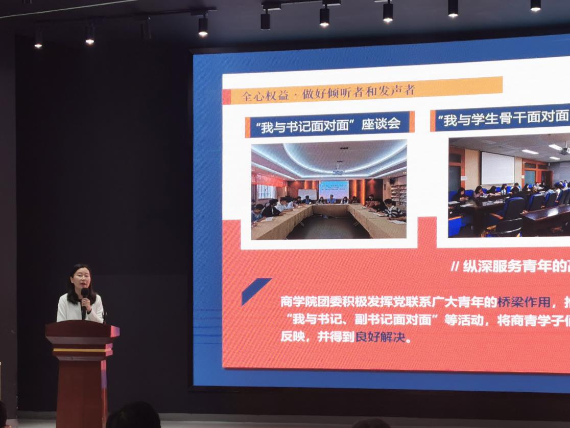 来自16个学院的分团委书记(负责人)根据抽签顺序进行工作展示,各家团干部围绕学校中心工作和共青团年度工作要点,回顾了一年来各学院在思想政治引领、基层组织建设、宣传活动、科技创新与就业、志愿服务与社会实践、校院文化活动品牌建设等方面所做出的努力以及取得的成果。将经验总结和认识体会相结合,将问题建议和计划目标相统一,述职内容聚焦bat365官网共青团凝聚青年、思想引领的作用发挥,关注以“大抓基层”为导向的共青团组织建设具体措施,侧重以“实践育人”为核心的新型人才培养体系的反哺效果,贯穿于服务学生成长成才的“第二课堂成绩单”平台的效果反馈等多个方面,用图文并茂的形式呈现了一场场精彩纷呈的述职汇报。