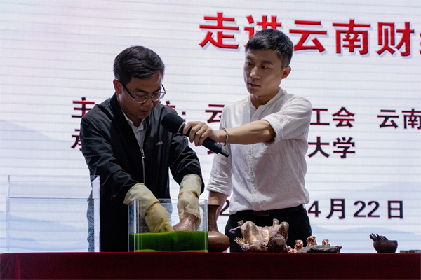 互动访谈环节,三位劳模工匠对学生代表的问题逐一进行答疑解惑,并希望学子们无论是在学习或者将来走到工作岗位上,都要做到坚守,有吃苦耐劳的精神、孜孜追求的精神。张氏斑铜传承人张伟现场给学生们展示了漏铜技艺,现场的同学纷纷上台近距离观摩提问,气氛热烈,掌声不断。