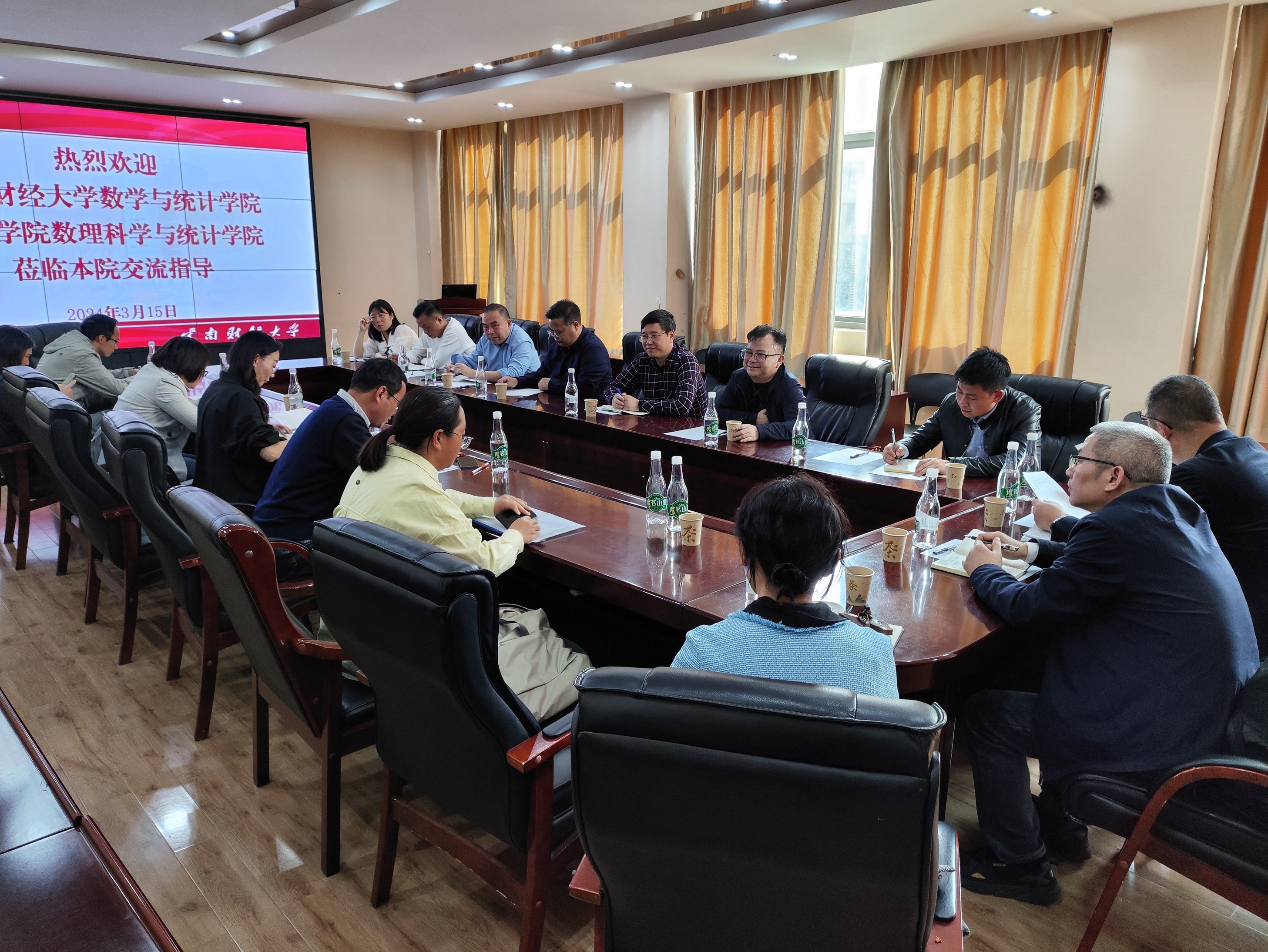 为贯彻落实党中央、国务院关于高校毕业生就业工作的决策部署,千方百计开拓更多就业岗位和机会,深入落实就业工作“一把手”工程,3月15日下午,贵州财经大学数学与统计学院党委书记虞帆一行6人、百色学院数理科学与统计学院院长姚源果一行5人到bat365官网统计与数学学院开展学生就业、实习、合作办学等交流,座谈会由统计与数学学院党委书记杨媛妮主持。