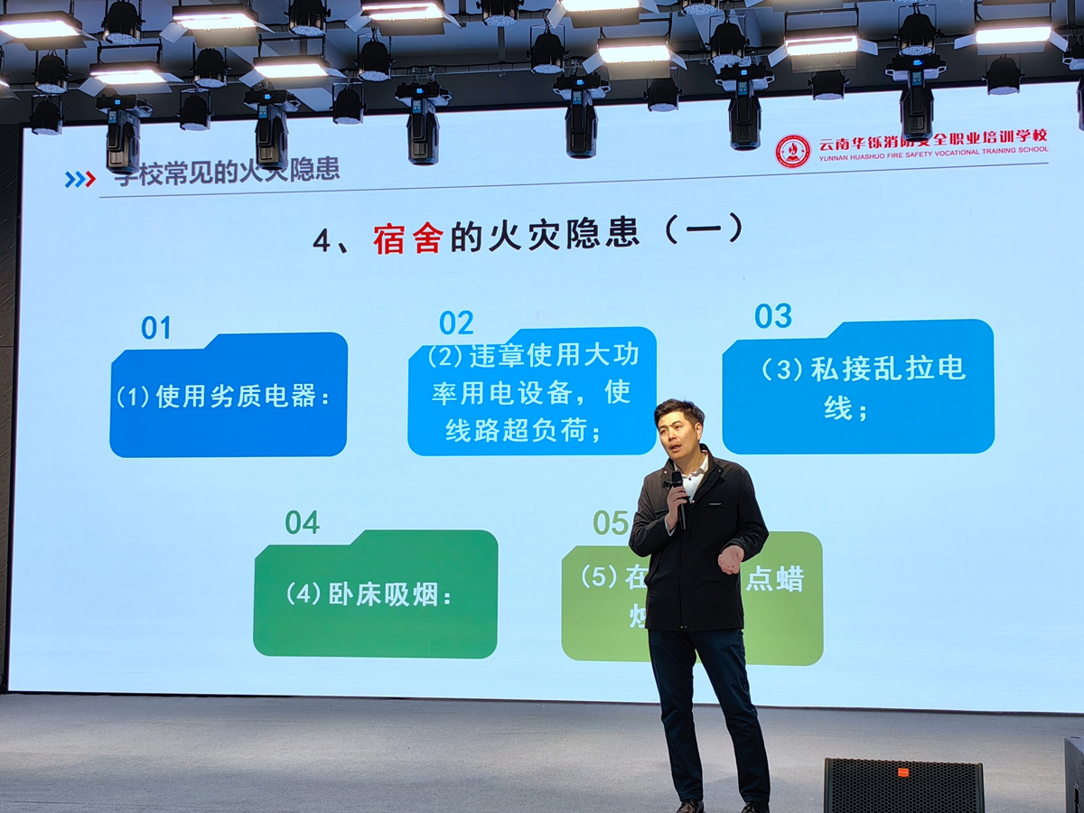 李超针对学生公寓、办公区域、礼堂等校内场所,从常见的火灾隐患、火灾危害、火灾处置、人员疏散、人员救治等方面,结合实例为大家细致深入地讲授了相关消防安全知识。