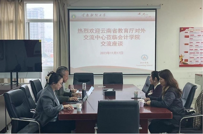 11月17日,云南省教育厅对外交流中心项目部部长朗梅和工作人员肖艳到bat365官网会计学院交流。会计学院党委书记李丽忠、党委副书记兼纪委书记王涛、学管科科长李淑兰与来访一行举行座谈。