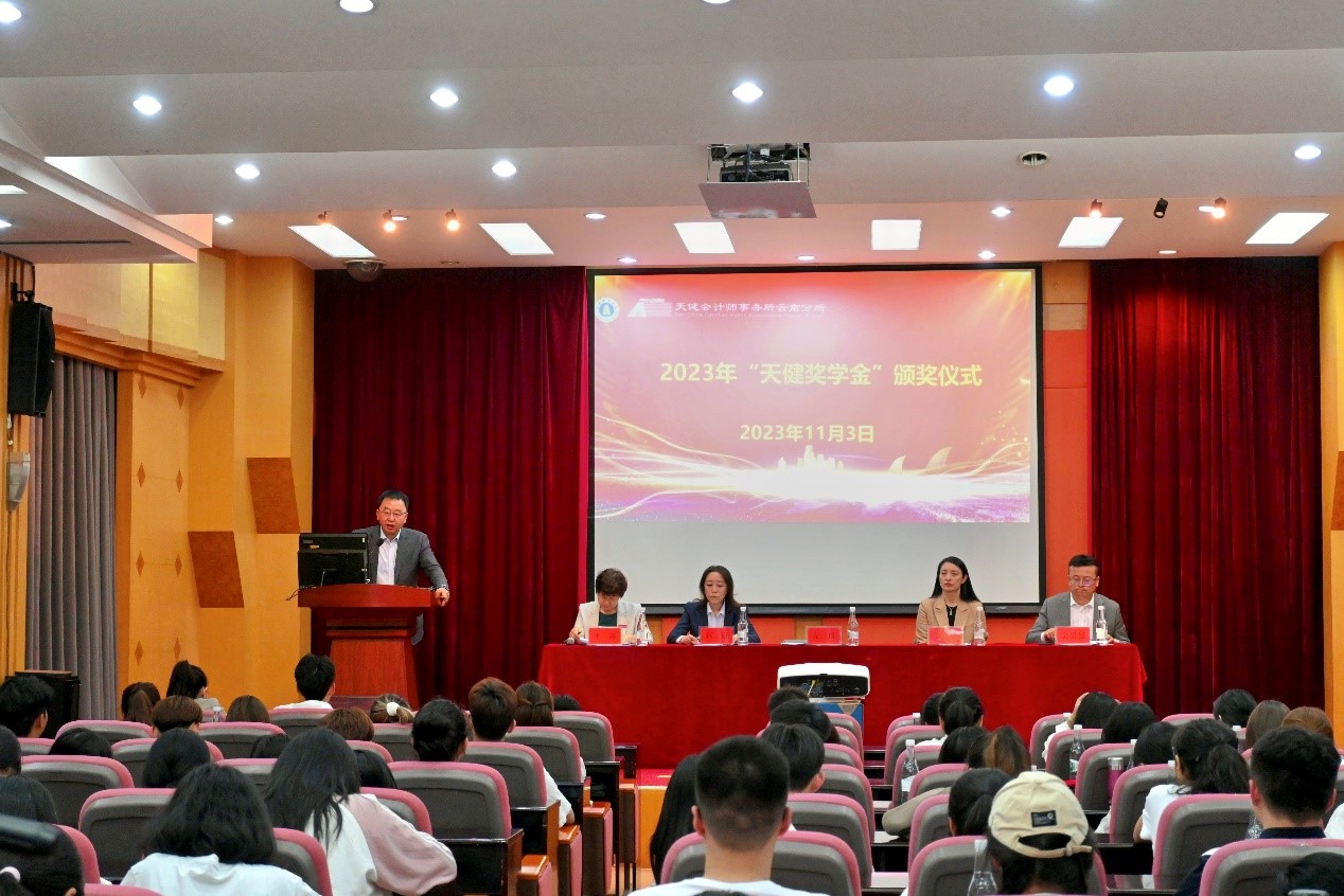 11月3日下午,会计学院在钟正山美术馆一楼报告厅举行2023年“天健奖学金”颁奖典礼。天健会计师事务所云南分所总经理左翔,副总经理赵蕊及相关工作人员,校友工作办公室主任兼教育发展基金会秘书长章玲,会计学院党委副书记王涛、副院长吴昊旻及获得2023年度“天健奖学金”的全体同学参加。颁奖仪式由王涛主持。