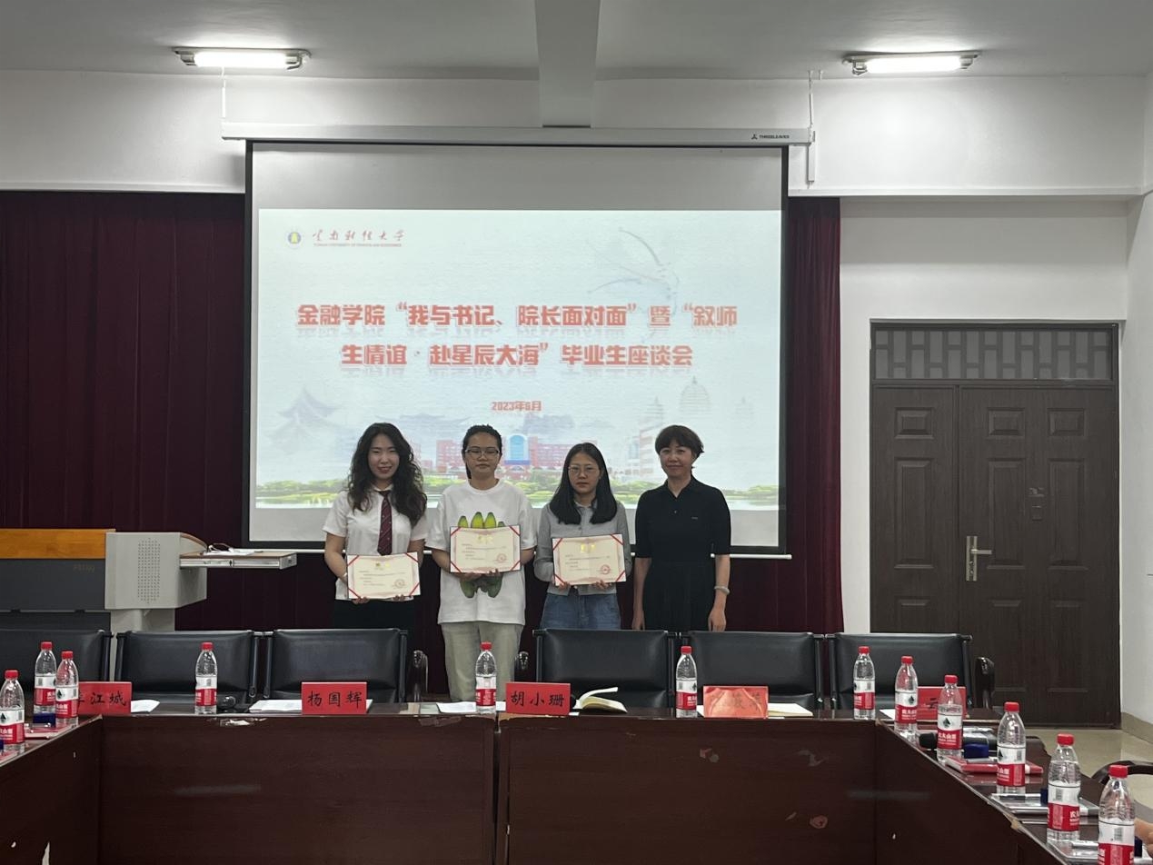6月27日上午,金融学院举办了主题为“我与书记、院长面对面”暨“叙师生情谊·赴星辰大海”毕业生座谈会。座谈会由学院党委书记胡小珊主持,学院党政领导班子、院团委书记与24名本研毕业生参加。