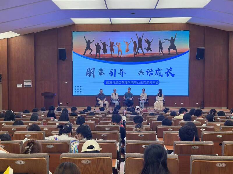 为调动朋辈教育力量,加强对低年级大学生成长指导,5月25日下午,旅游与酒店管理学院在鹏云一附101报告厅举行“朋辈引导,共话成长” 优秀毕业生先进事迹分享会。本次活动以访谈形式开展,话题主要围绕大学生学业发展、社会实践与就业等方面内容,2023届毕业生段秀玲、郜啸宇、李佳懿、吕竞汉、郑彤彤5位同学应邀做经验交流。学院党委副书记李永祥,学生科科长孙晓琼,辅导员谷彦霆、张瑞程及180余名毕业生参加。