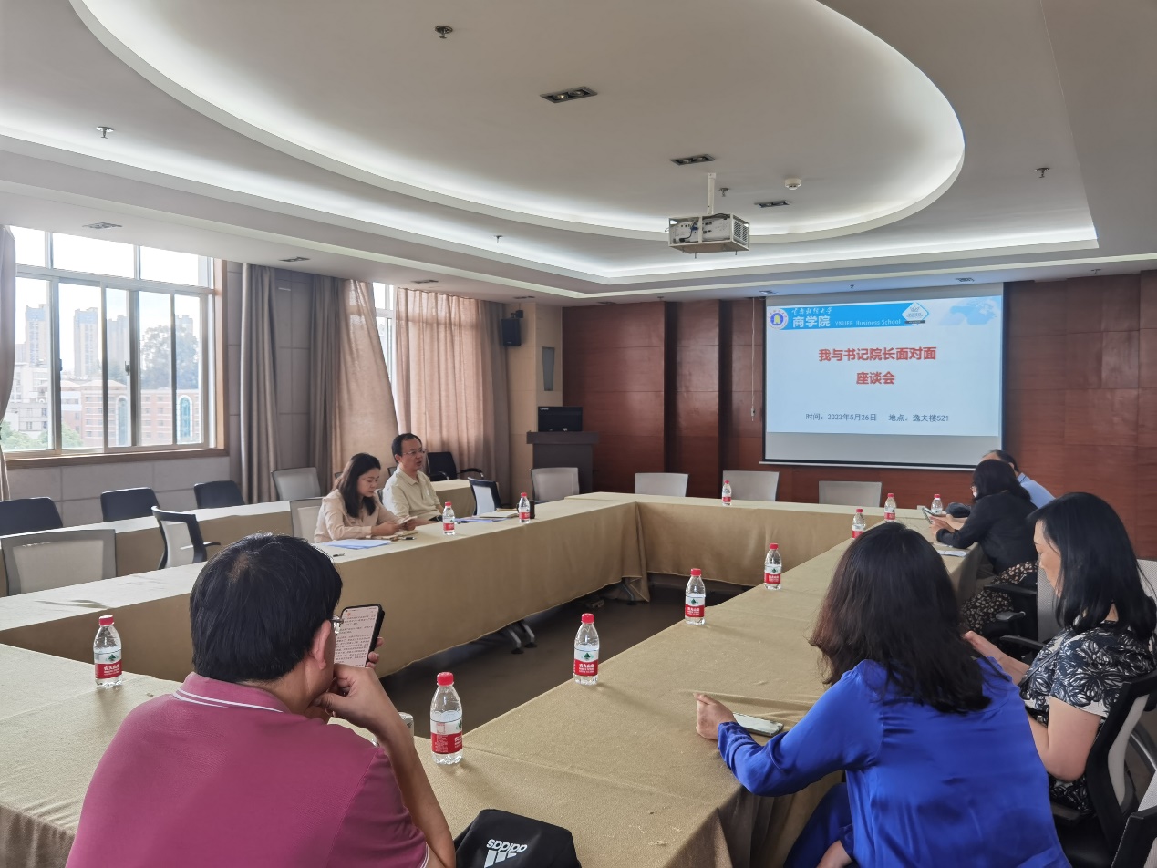 为加强学院领导与师生的联系,及时了解学院师生在日常工作、学习生活中的问题,促进学院各项工作的顺利开展,5月26日,商学院在南院逸夫楼521会议室召开“我与书记、院长面对面”座谈会,座谈会分别面对学生和教师代表举行。商学院党委书记王敏、院长杨增雄、团委负责人刘煜、共青团干部曹明珏及商学院教师代表、学生代表参加。