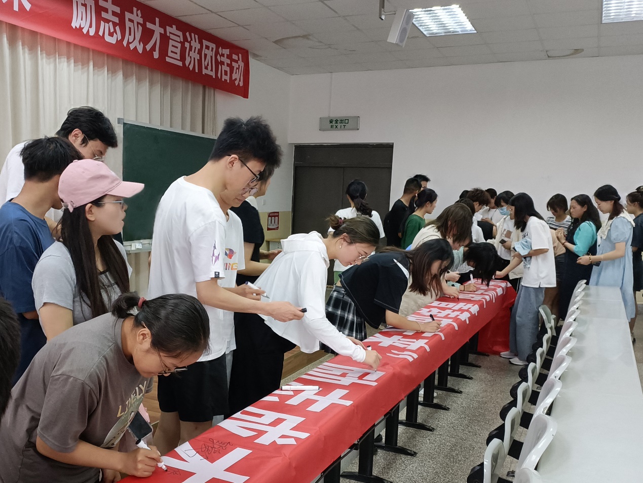 本次遴选的宣讲团成员均是在国家资助下自强不息、励志成才的典型,他们既是资助政策的受益者,也是最佳的政策宣讲者。宣讲团成员全面详细地介绍了国家和学校“奖、贷、勤、补、免”多元融合的助学体系并通过讲述自身受助经历,分享了在大学期间学习生活和社会实践等方面的心得体会和经验,同时他们鼓励学弟学妹们结合自身发展目标进行学习规划,做到勤于专业、勇于挑战,让大学生活在国家和学校多方面资助下节节开花。活动最后,现场同学们在宣讲团成员的感染和鼓舞下主动在横幅上签字,表达了自己奋发向上的决心以及对大学美好生活的期待。