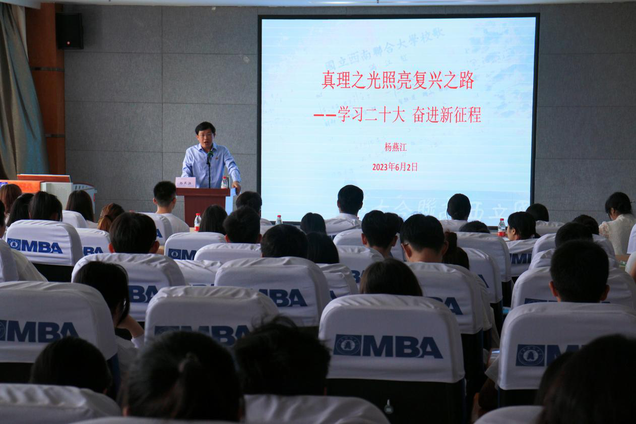 6月2日中午,商学院在南院逸夫楼410报告厅开展“真理之光照亮复兴之路——学习二十大 奋进新征程”主题教育专题党课。云南西南联大干部培训基地教务部主任杨燕江受邀担任主讲人,商学院师生党员代表100余人参加。党课由学院党委副书记兼纪委书记朱次毅主持。