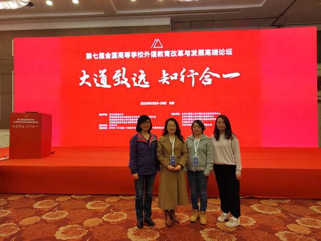 3月25、26日,以“大道致远、知行合一”为主题的“第七届全国高等学校外语教育改革与发展高端论坛”在北京举行。教育部领导、教指委专家及两千余位高等外语教育界专家学者齐聚北京,7大直播平台共16万高等外语教育从业者云端参会。国际语言文化学院院长刘代容、副院长孙婷婷、大英中心主任董雪及教师代表王红参加了本次活动。