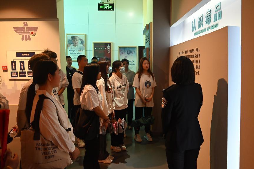 在禁毒基地一楼,禁毒学院的讲解员给大家介绍了毒品的危害。毒品的危害分为身体危害和心理危害,两种危害带来的后果都不容小觑。讲解员也通过展板上一个个真实的案例来告诫同学们及身边人要远离毒品。在禁毒基地二楼,讲解员为大家讲解了中国曲折的禁毒历史,同学们也了解到近代中国禁毒工作的不易。毒品问题曾是民族的一道伤疤,也与近代的国运紧密相连。百年余前,西方侵略者通过贩卖鸦片这种卑劣的手段,在中国国门上挖了一个洞,虎门销烟、鸦片战争等历史深深烙印在民族记忆之中。当今,中国对毒品采取零容忍态度,全国人民上下一心全面反毒。