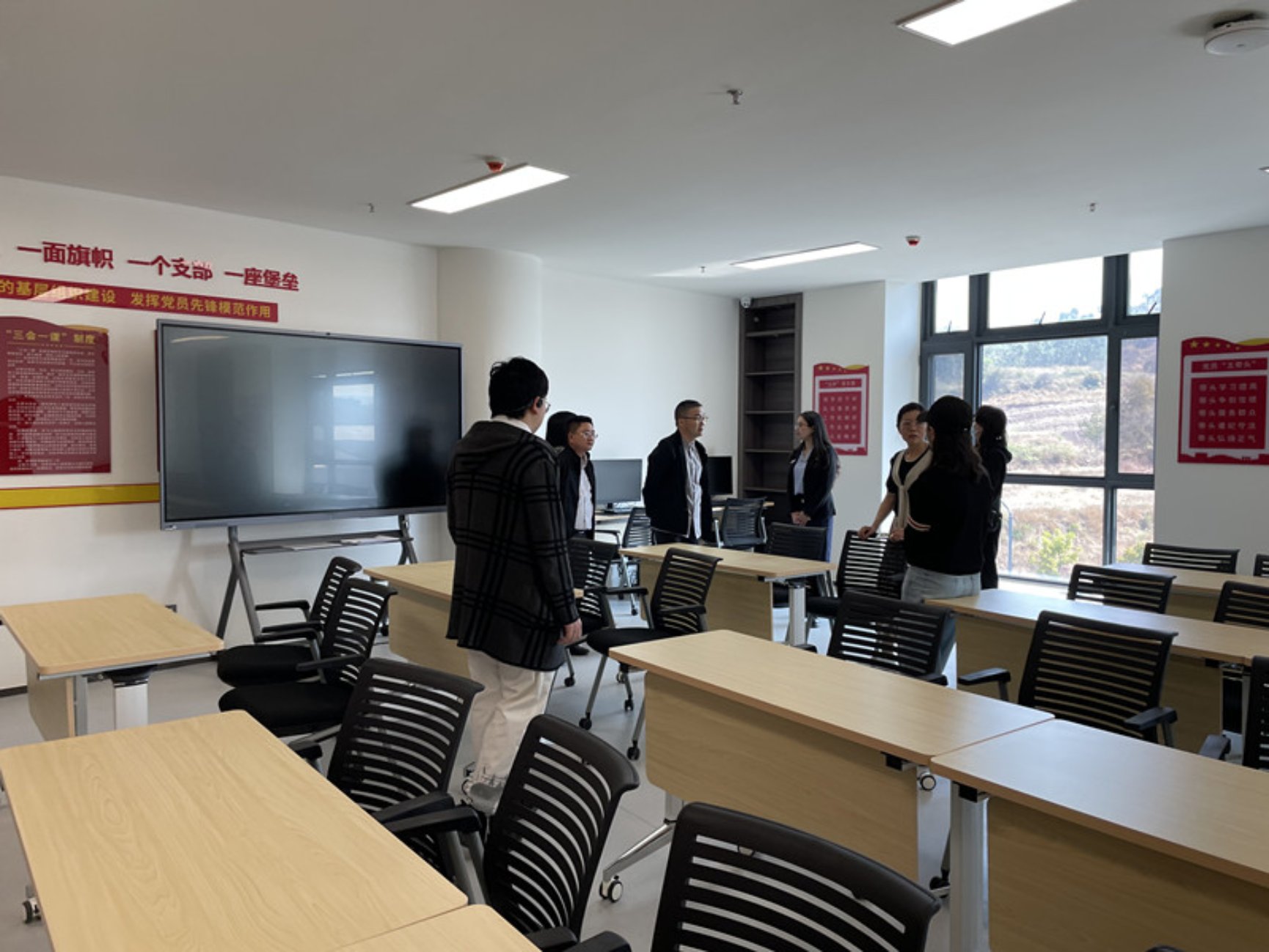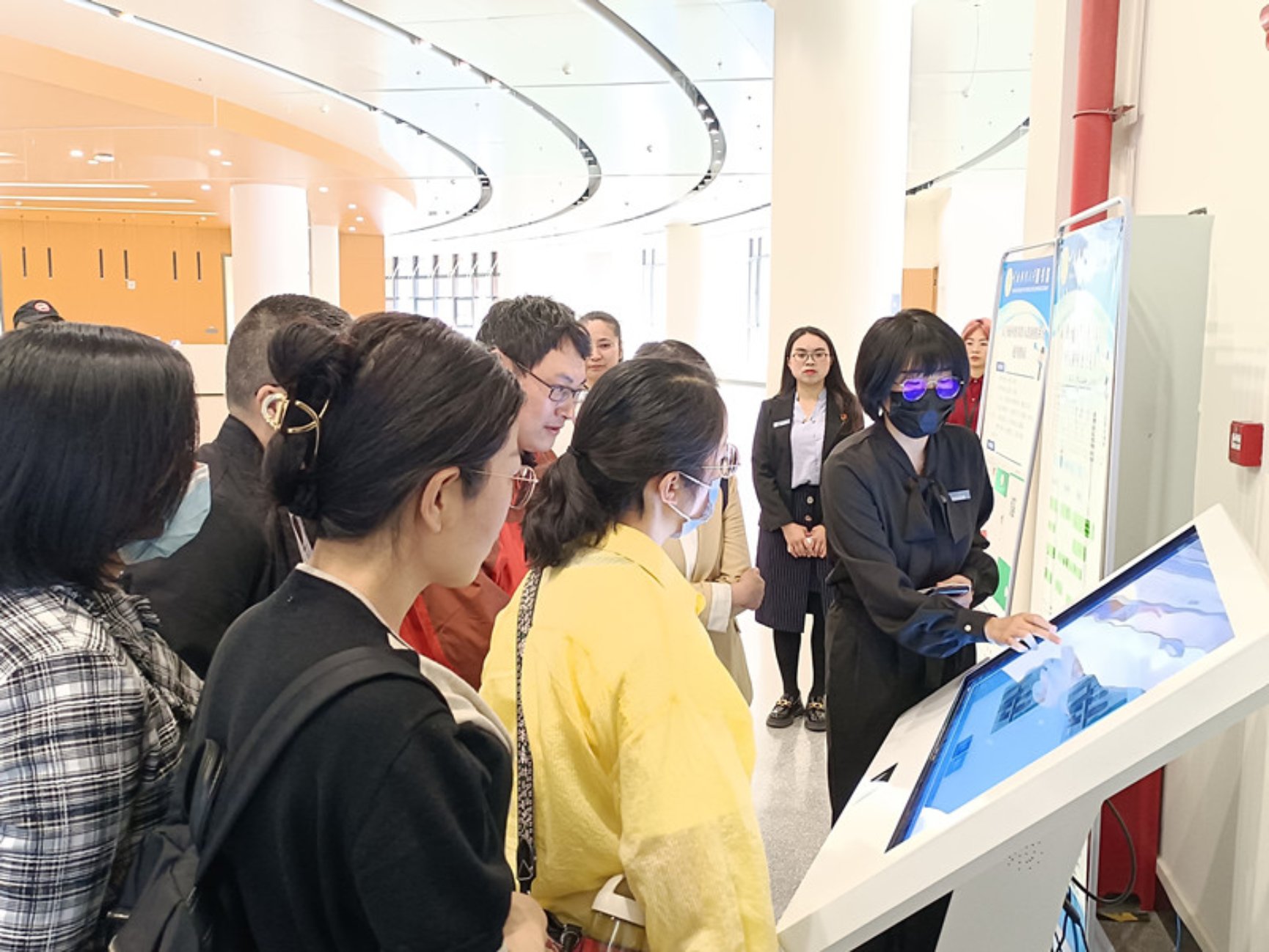 云南大学图书馆一行参观了安宁校区图书馆各楼层的功能布局,重点对预约式党员活动中心、RFID智能借还系统、座位管理系统等设施设备进行详细了解。