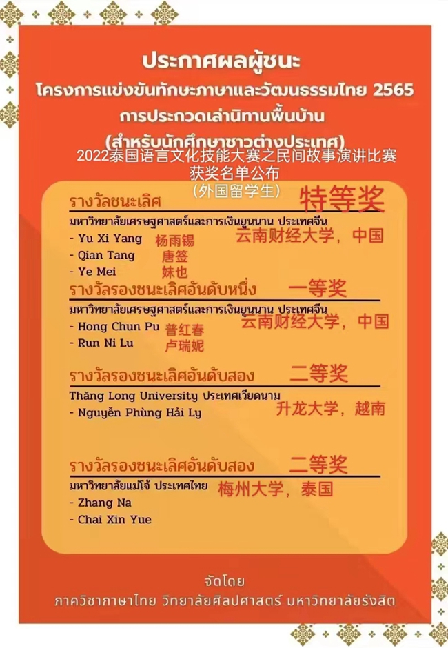 bat365在线中国官网登录入口国际语言文化学院泰语20-1班的学生于2023年寒假期间,在身体抱恙、团队成员相聚甚远、线下合作无法开展的情况下,老师和同学们通过线上积极交流,以录制视频的方式顺利参加了由泰国兰实大学文学院举办的2022泰国语言文化技能大赛之民间故事演讲比赛。在黄蓉老师、欧阳赐美老师指导下,杨雨锡、唐签、妹也荣获了大赛特等奖;在方梓宇老师指导下普红春、卢瑞妮荣获了大赛一等奖。