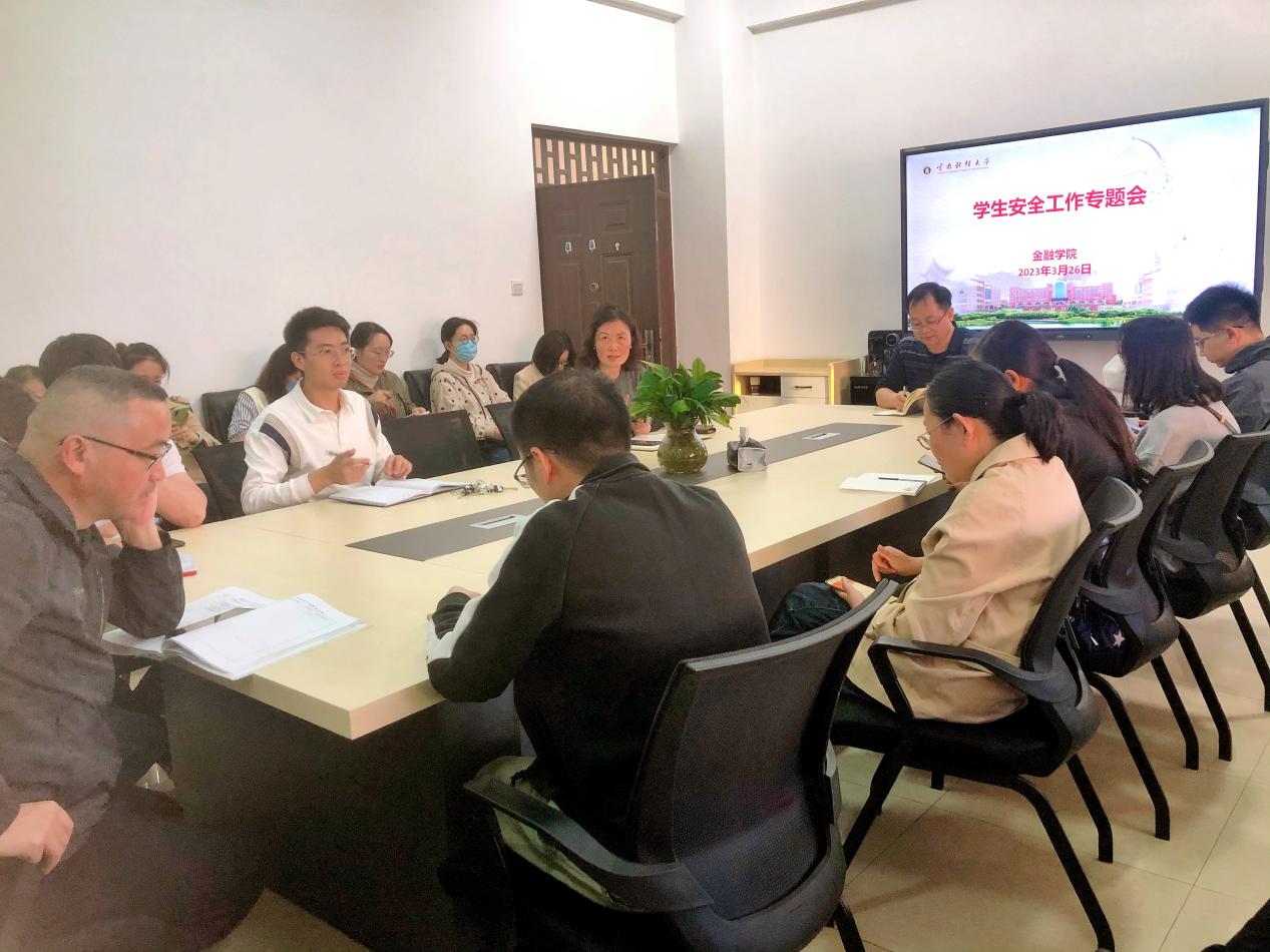 为进一步做好学生安全工作,加强学生安全教育和管理,3月26日,金融学院在博远楼115会议室召开学生安全工作专题会。学院党委书记李德清、党委副书记汪薇萍、副院长李江城、全体辅导员和班主任参加会议,会议由汪薇萍主持。