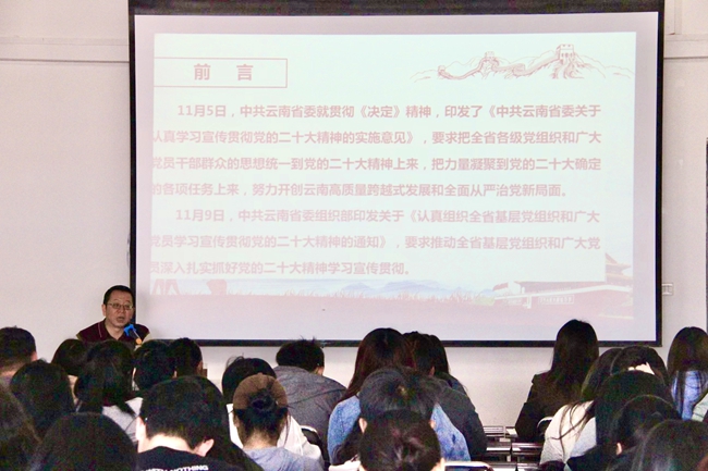 杨秀伟从学习宣传贯彻党的二十大精神的重大意义、全面准确学习领会党的二十大精神、做好党的二十大精神的贯彻落实三个方面带领大家进行学习。杨秀伟重点从学习领会党的二十大精神需要着重把握的九个方面进行了讲解,带领同学们从十六个方面详细学习领会过去五年的工作和新时代十年的伟大变革,让同学们深刻理解和认识党的二十大召开,对于谱写新时代中国特色社会主义新篇章、奋力实现中华民族伟大复兴的中国梦有着重要指导作用和现实意义,激励青年团干在党的领导下,心往一处想,劲往一处使劲,为实现中华民族伟大复兴的中国梦而努力奋斗。