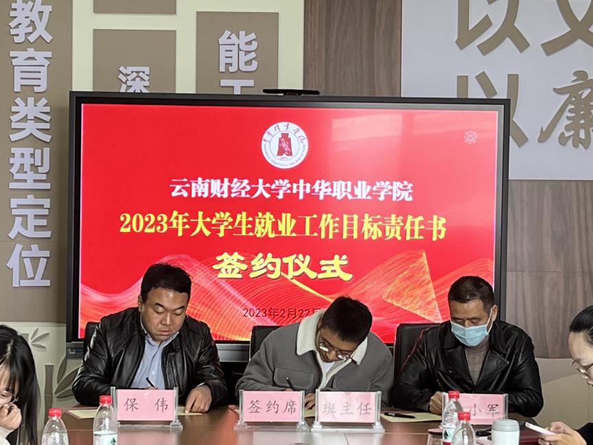 2月22日下午,中华职业学院在修远楼512会议室召开2023届毕业生就业工作推进会。会上,学院党委书记保伟、院长李小军与辅导员代表和毕业班班主任代表分别签订了《bat365在线中国官网登录入口中华职业学院2023年大学生就业工作目标责任书》。各教学部分管就业工作的辅导员及2023届全体毕业班班主任参加会议。会议由学院党委副书记兼纪委书记张玉琨主持。