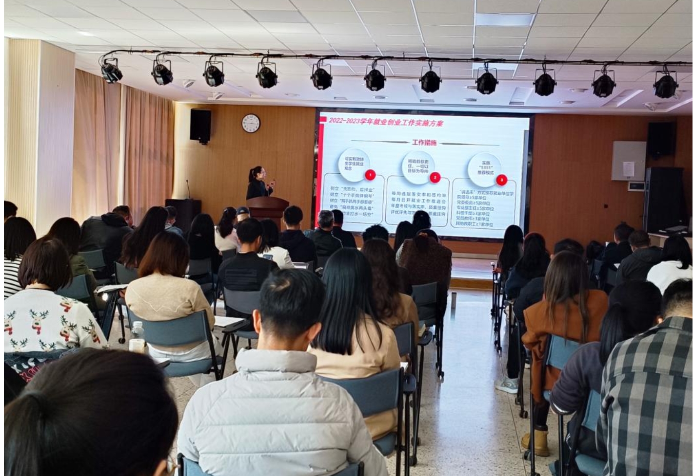 10月19日下午,中华职业学院在修远楼204室召开2022-2023学年就业工作推进会。院长李小军,学院党委书记保伟,副院长宁东玲、陈应龙,党委副书记于浩,各教学部分管就业工作的辅导员及2022届、2023届全体毕业班班主任参加会议。会议由学院党委副书记兼纪委书记张玉琨主持。