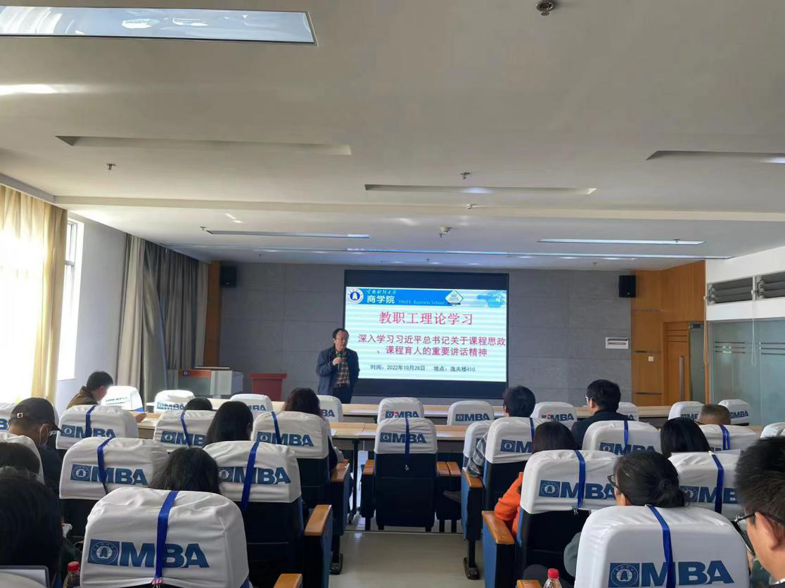 为指导全体教职工全面准确学习领会党的二十大精神,10月28日下午,商学院在南院逸夫楼410报告厅组织开展本月的理教职工论学习。学院党委书记王敏和院长杨增雄主讲,办公室主任江东书主持,全体教职工参会。