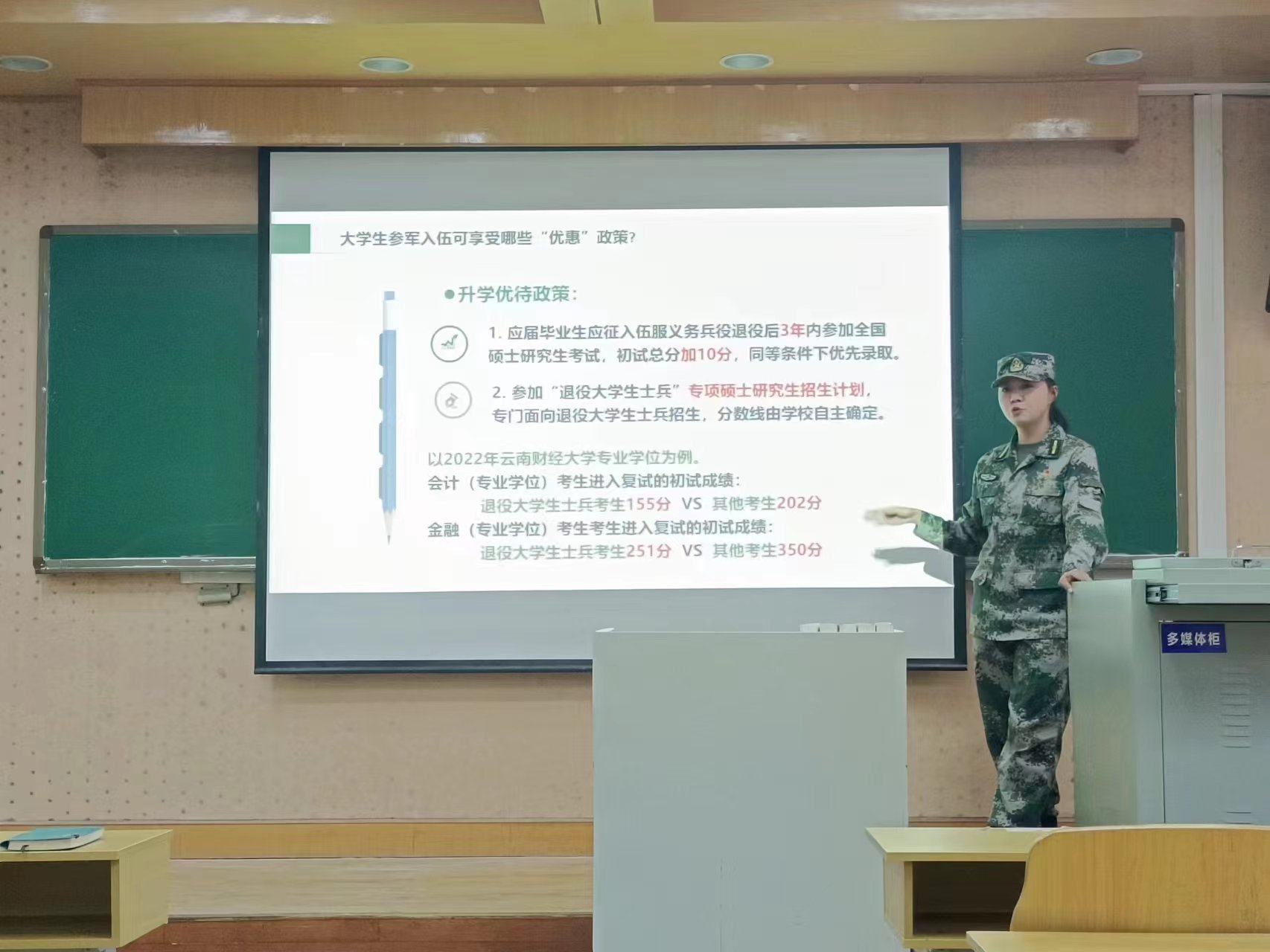 尹航从大学毕业生参军入伍的意义、时间点、“优先”政策、“优惠优待”政策和参军入伍的条件和程序等五个方面,深入讲解了国家、云南省和学校应征入伍的各项条件和政策。同时结合国家需要和个人发展,诠释了为什么要当兵、为谁当兵、入伍的意义等系列问题,详细解答了学生的应征疑问,激发了参会学生积极参军入伍的热情。