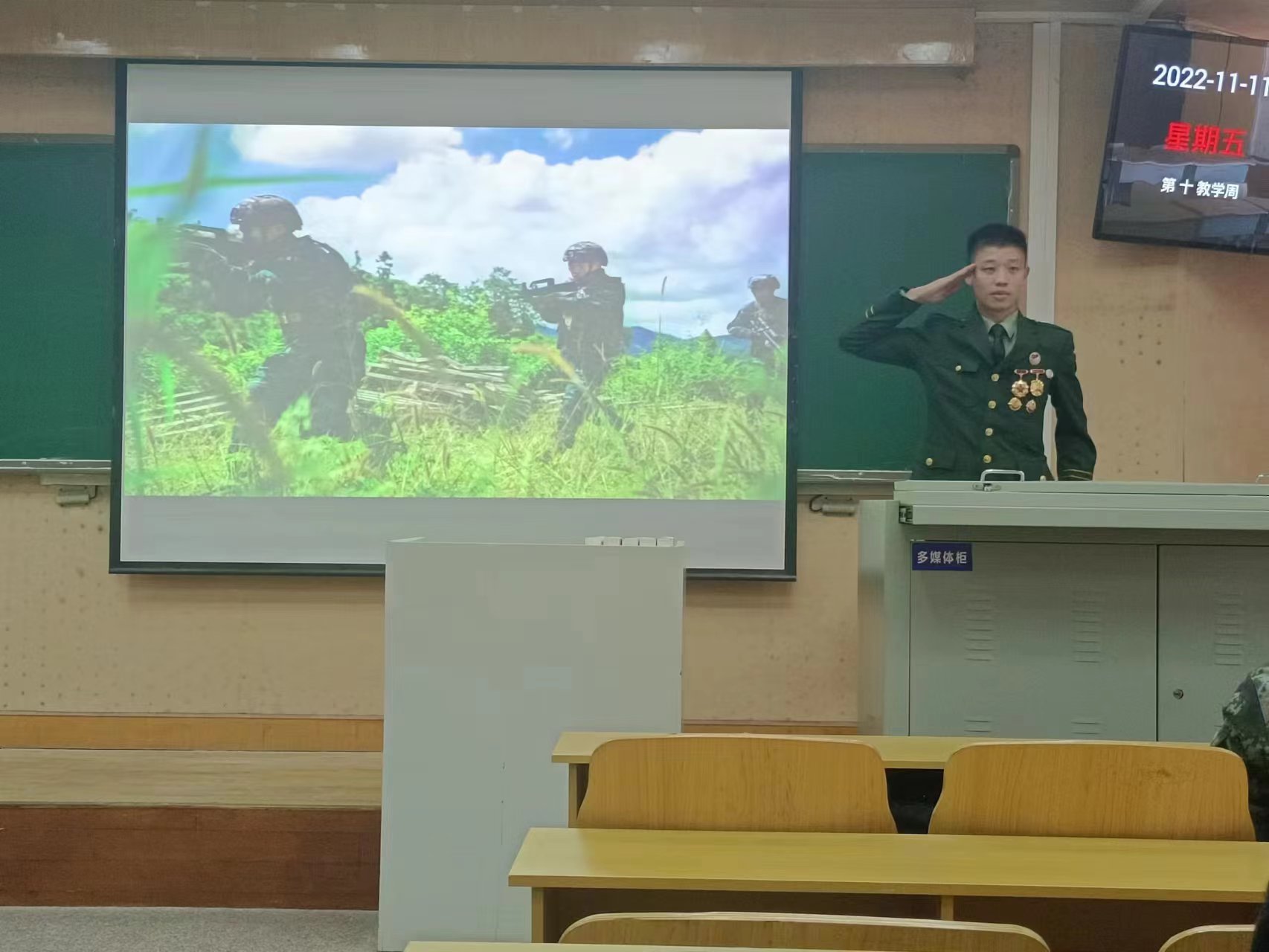 宣讲会还邀请了学校2022年退役学生、法政学院毛宇成和金融学院杨鑫萍现身说法,结合自身在部队服役的经历与收获进行分享,并从学生的角度,回答了同学们关于参军入伍的问题。