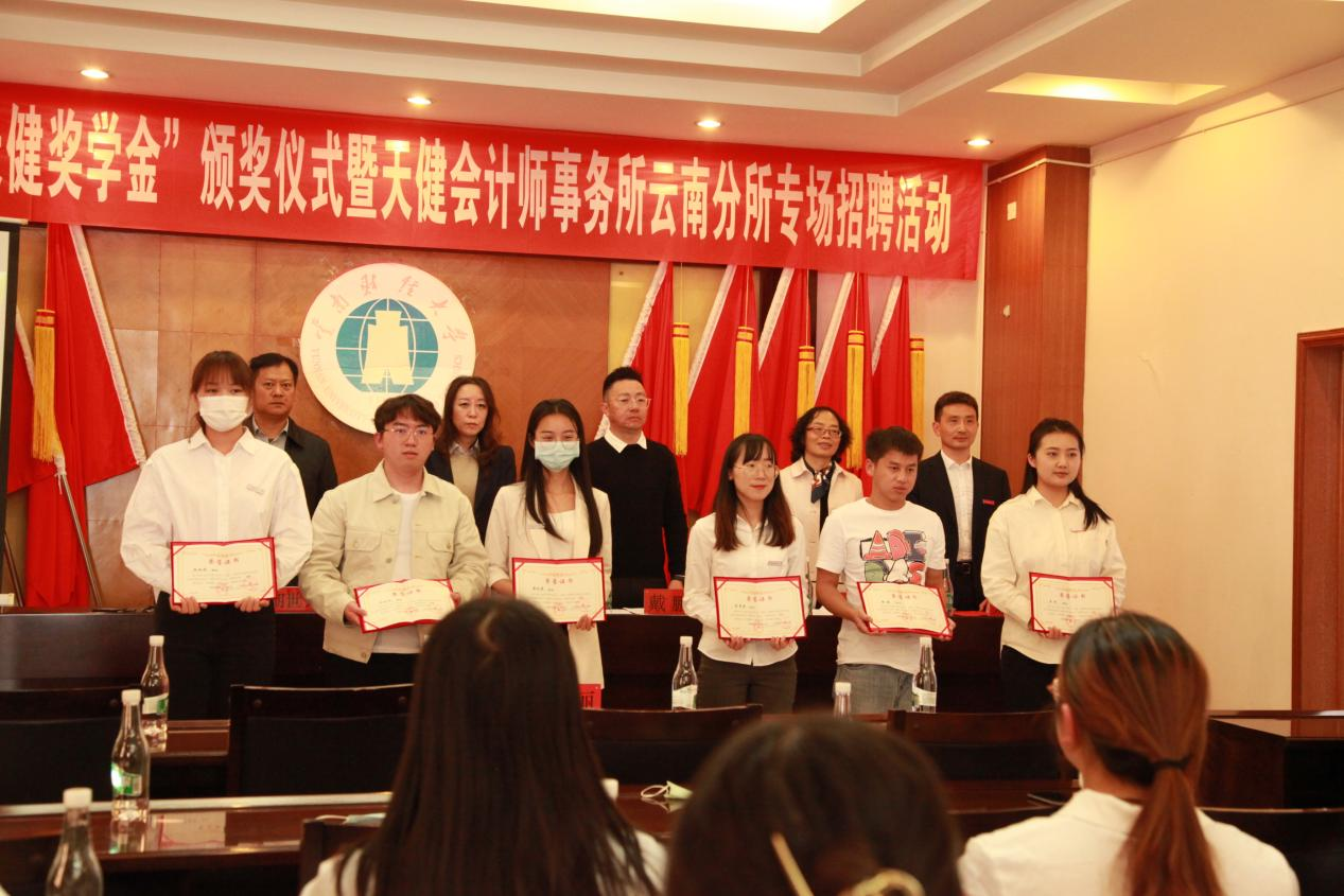 11月11日,bat365官网会计学院举行了2022年“天健奖学金”颁奖仪式。天健会计师事务所云南分所副总经理戴鹏、赵蕊及工作人员胡亚丽,会计学院副院长罗莉、刘昌胜,学院教师及获得2022年度“天健奖学金”的全体同学参加颁奖仪式。仪式由学校校友工作办公室副主任胡世文主持。
