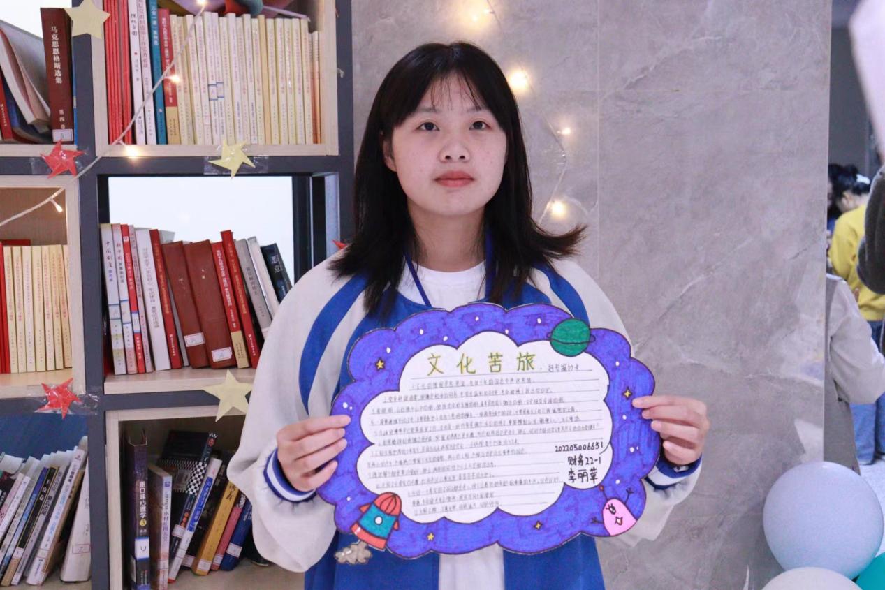 本次读书分享会活动设有制作好书推荐卡、制作书籍阅读思维导图、撰写分享读书心得、拍照打卡四个活动板块,参与活动的同学除拍照打卡这一必选项外,可任意从其余板块中选择两个板块参与。在本次活动开展期间,同学们积极阅读红色经典、人文历史、诗歌散文、社科哲学等各类书籍,并与其他同学交流读书心得,还将自己制作的好书推荐卡和撰写的心得体会在修远楼一楼的读书角进行分享展示。