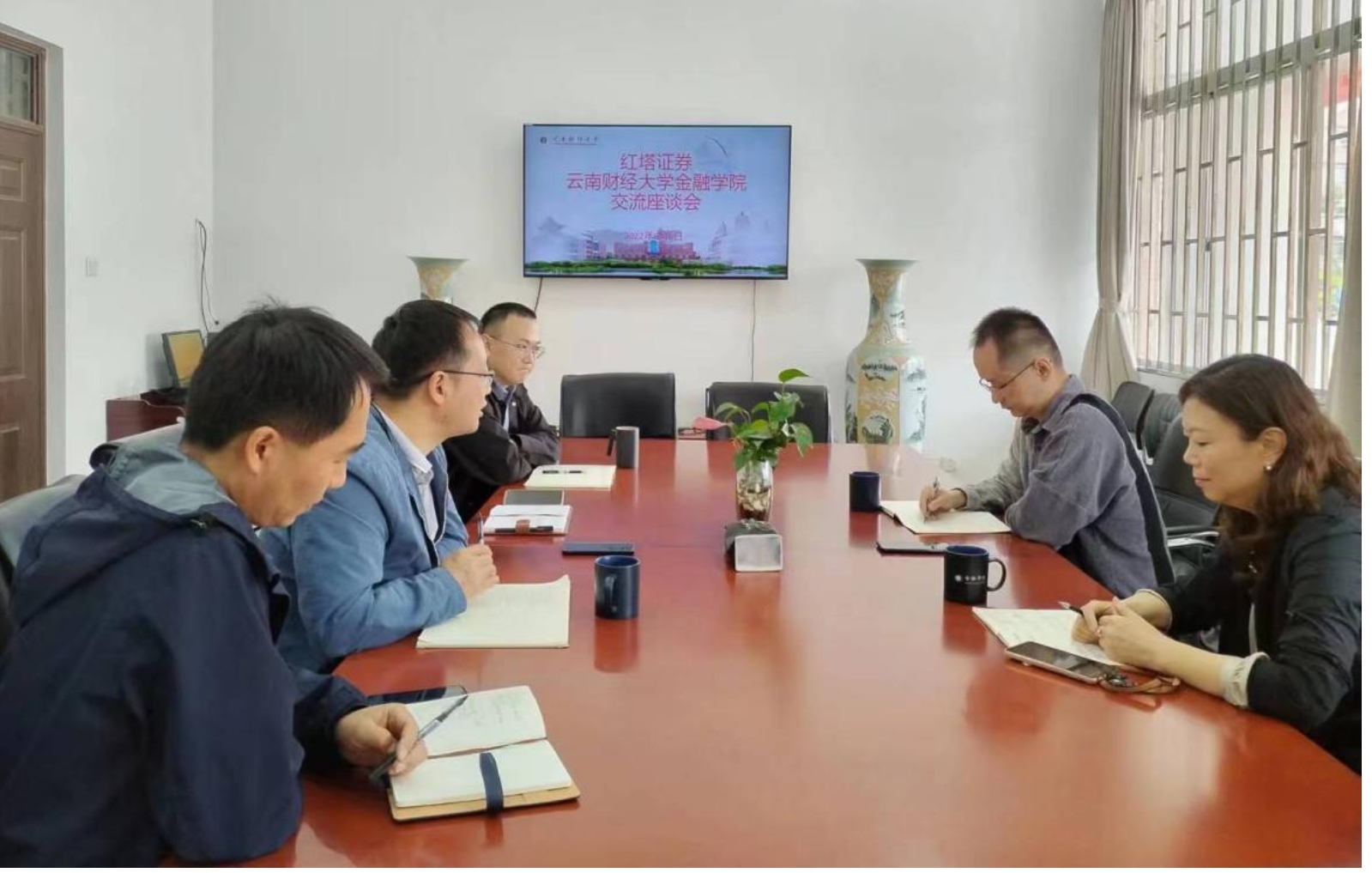 6月9日,红塔证券财管中心总经理助理朱懿、红塔证券投资者教育经理陈方到bat365官网金融学院,与学院党委书记李德清,党委副书记汪薇萍,副院长李江城、杨国辉进行交流座谈。