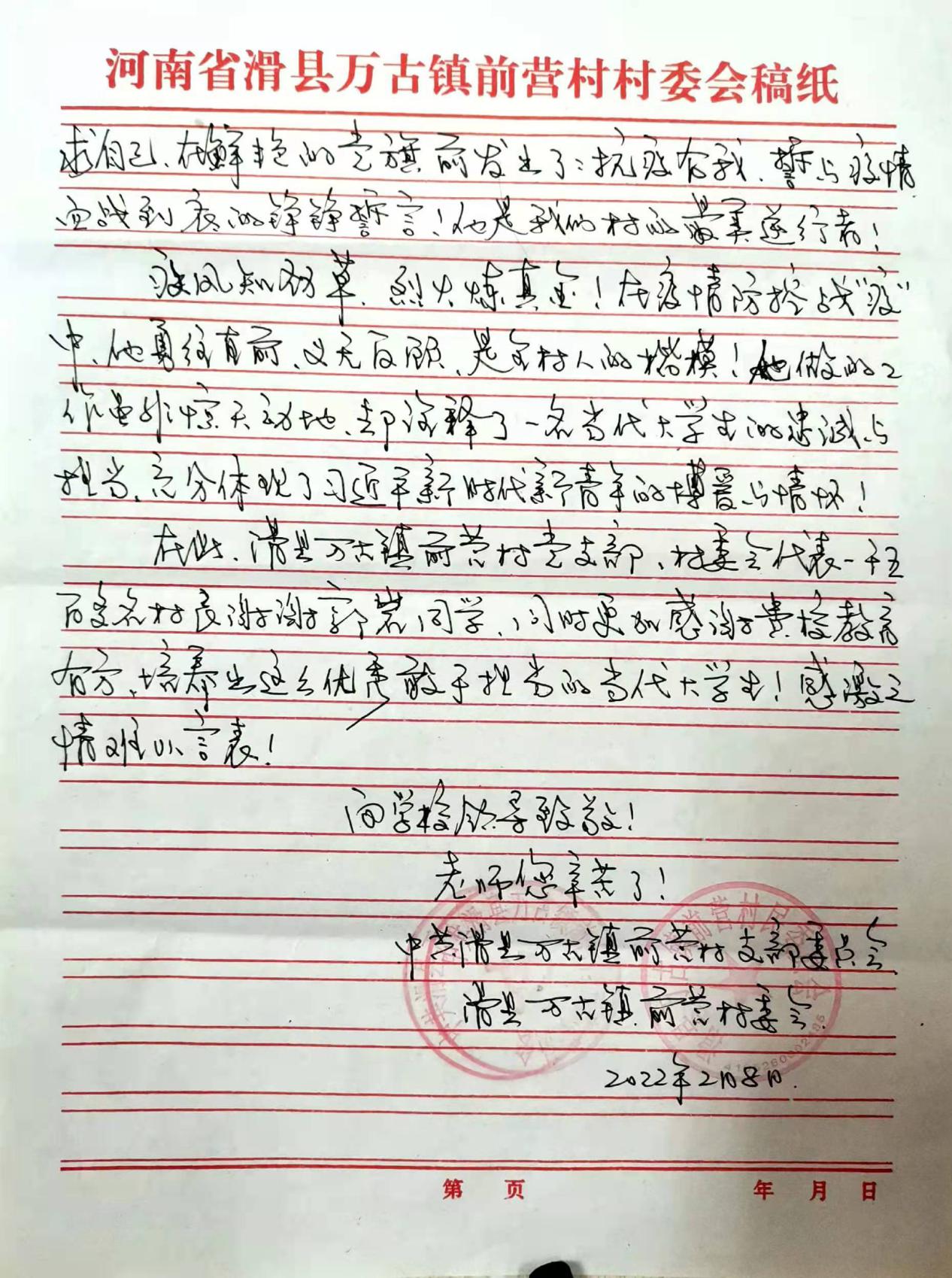 2022年1月8日,河南省滑县出现一例新冠疫情阳性病例,滑县全县立即进入疫情防控战备状态,郭岩同学主动请缨,积极投身到疫情各项志愿活动中。郭岩同学不顾个人安危,起早贪黑、冲锋在前,帮助村委会同志进行核酸检测、疫情防控知识宣传、物资准备等工作,能用党员的标准严格自己,充分体现了新时代青年的责任担当和家国情怀。万古镇前营村党支部、前营村委员会对学校和学院的教育工作给予了充分的肯定和赞扬。