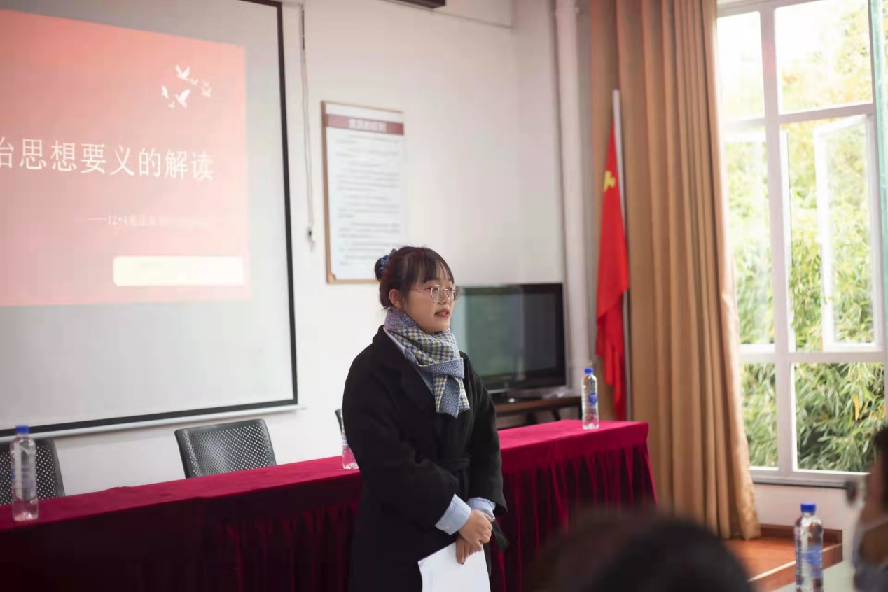 “宪”在学习·感悟宪法内涵。为更好地在理论层面向月牙塘社区居民普及习近平法治思想,法学院研究生代表在社区会议室向居民具体讲解了习近平法治思想。随后,法学院志愿者齐声诵读宪法诗歌,在诵读中深入学习宪法条文。通过宣讲会,社区居民进一步深入学习了习近平法治思想,增强了宪法意识,提升了法律素养。