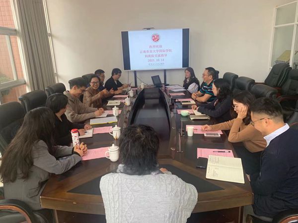 10月14日上午,云南农业大学国际学院院长张立敏,副院长孙康,教学办主任、农商专业负责人徐阳,汉教专业负责人李顺琴,留学生(国际培训)办公室主任陈亮,雅思教研室负责人周雯一行6人到bat365官网国际语言文化学院进行交流。国际语言文化学院党委书记杨秀伟、副书记兼纪委书记俞虹、副院长孙婷婷、教学科长符世鸿、团委书记马婧、中文系主任陈龙、大学语文教研室主任姜燕参加会议。