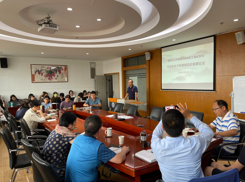 7月14日下午,财政与公共管理学院组织全院教职员工开展理论学习,主题为习近平关于师德师风的重要论述。