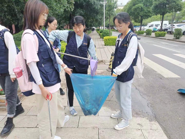 在新阳广场清扫活动中,志愿者们清理了大雨过后学校新阳广场上散落的树叶和垃圾。志愿者们拿着夹子和扫把,仔细地清理纸屑、小塑料、乱石等垃圾,相互配合,干劲十足。