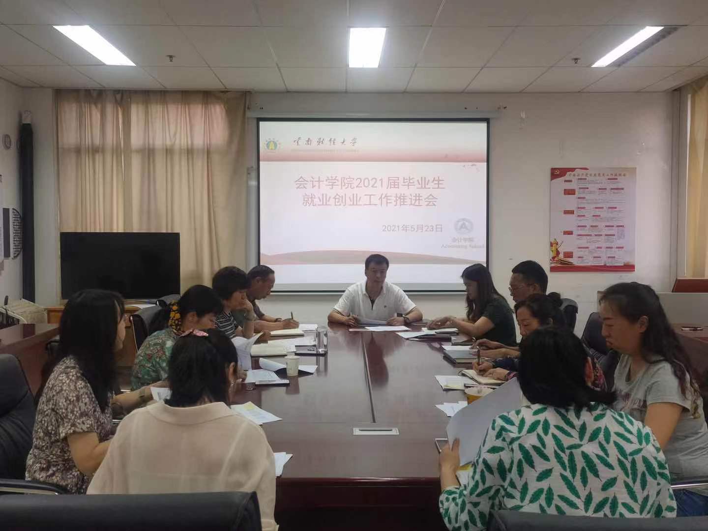 5月23日晚19:00,会计学院在逸夫楼820开展2021届毕业生就业创业工作推进会。会计学院党委书记徐良金、党委副书记王涛、副处级辅导员张剑锋、学管科科长李淑兰以及全体毕业生班主任参加本次会议。