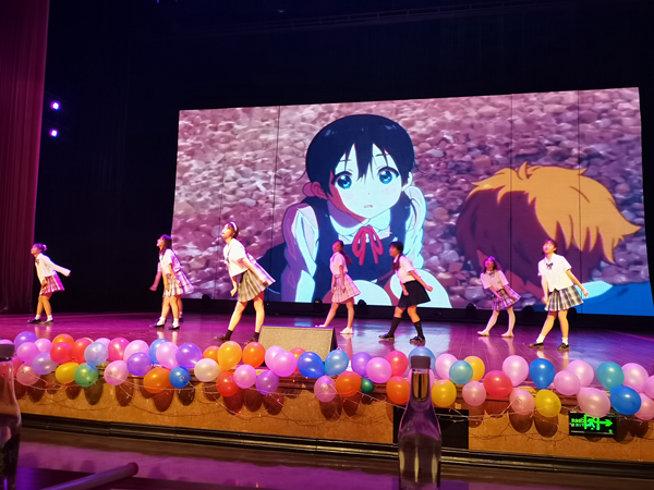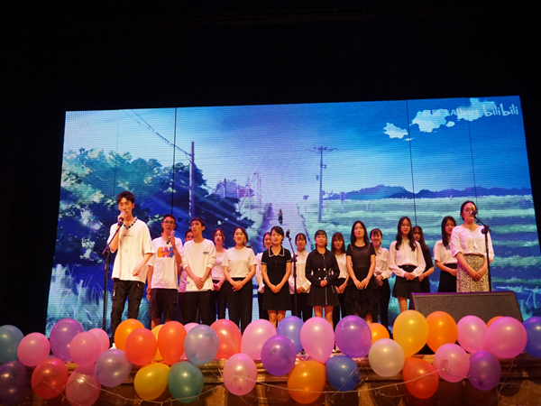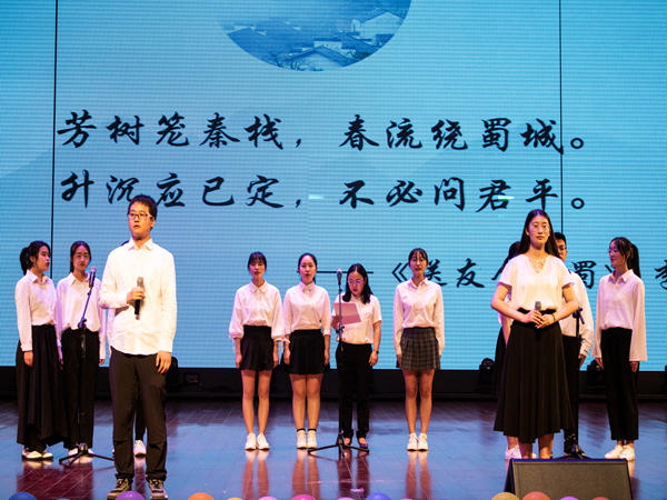 舞蹈《I am not cool》富有活力的节奏拉开晚会帷幕。泰语17-1班、缅语17-1班的小语种歌曲《不曾》《隐形的翅膀》以及汉语17-1班带来的诗朗诵《送别》诉说着对同学的不舍与对母校的眷恋。商英17-1班、越语17-1班、泰语17-2班同学带来的合唱《告白气球》《爱因为在心中》《同桌的你》深深触动了在座观众。日语社带来的宅舞表演展现了社团成员活泼向上的风貌。来自18级的董振兴和刘敏俩位同学带着《押韵歌》登上舞台,代表全体同学向毕业班的学长学姐致以最真诚的祝福。“大马小鹿”乐队也为同学们带来了精彩演出。