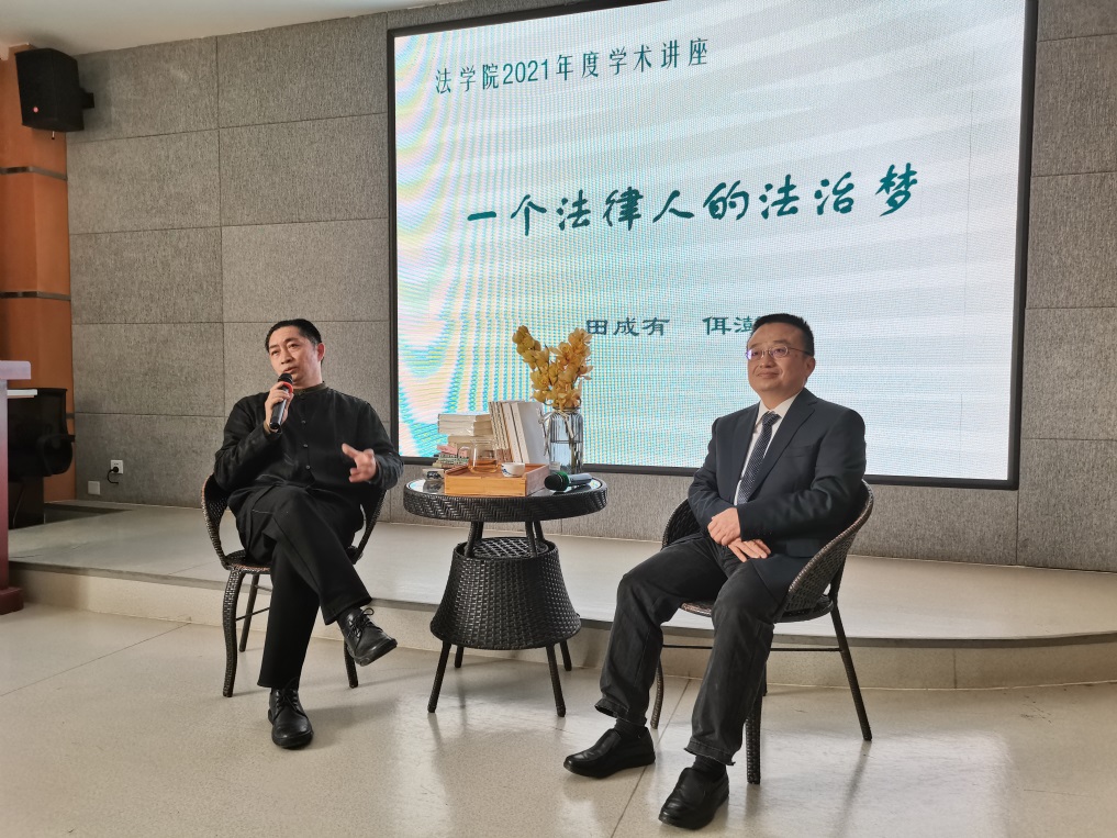 此次讲座采用学术访谈、线上线下同步直播的形式展开。田成有与大家分享了个人的学术心得和职业生涯感悟,表达了自己对法治与正义的愿景,阐述了自身对法律人责任与担当的认识。