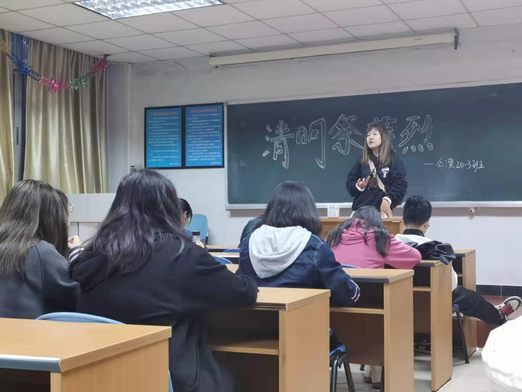 4月5日,会澳20-3班在班主任赵伦娜的带领下,以诵读烈士的诗歌、摘抄毛泽东的《七律长征》的形式开展主题班会。同学们表达了对革命先烈的沉痛悼念。