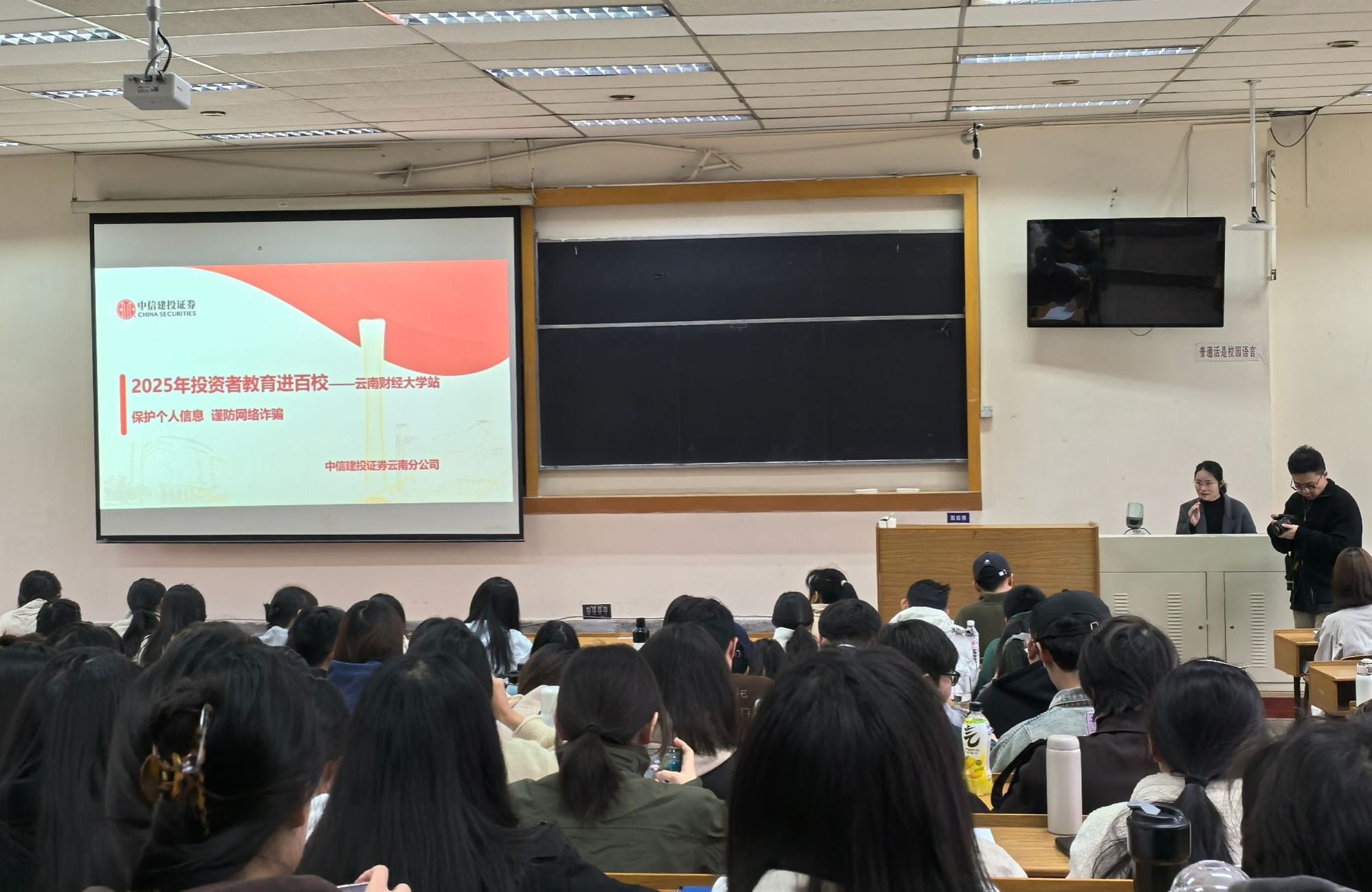 3月23日晚,会计(审计)学院举行反诈防骗宣传月活动第三期之“投资者教育进百校”活动,中信建投证券云南分公司罗娟应邀到校以“保护个人信息,谨防网络诈骗”为题举行讲座,2024级研究生及班主任200余人参加。