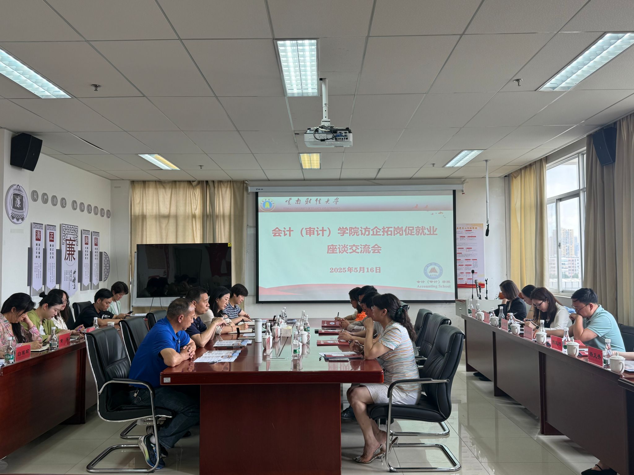 5月16日,会计(审计)学院"访企拓岗促就业"校企合作座谈会在逸夫楼820会议室举行。学院党委书记刘晓蓉、院长李小军等学院党政班子成员与11家企业代表就深化产教融合、优化人才培养机制进行深入交流。会议由学院党委副书记兼纪委书记王涛主持。