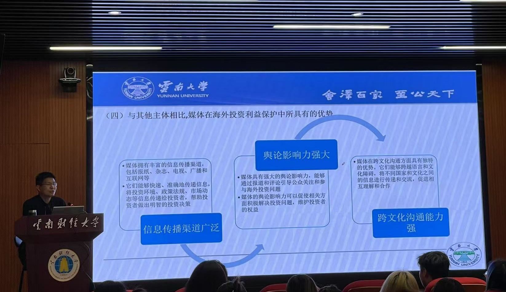 11月18日下午,传媒与设计艺术学院在齐远楼106报告厅举办《媒体在海外投资利益保护中的作用与角色》专题讲座。本次讲座由学校研究生院、云南网和学院联合主办,同时作为学院新闻与传播专业硕士学术质量提升和“双百双进”活动。讲座由云南大学法学院副教授、法学博士,兼职律师、北京中闻(昆明)律师事务所高级顾问刘红春主讲,传媒与设计艺术学院院长袁洪主持。