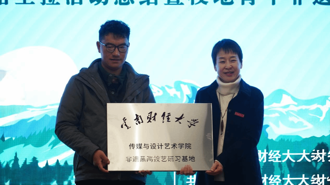 袁洪代表学院与香格里拉市吉诺陶社创始人拉茸肖巴签署了非遗黑陶技艺研习基地协议。共青团迪庆州委向此次为展览提供优秀展出作品的师生颁发了收藏证书。