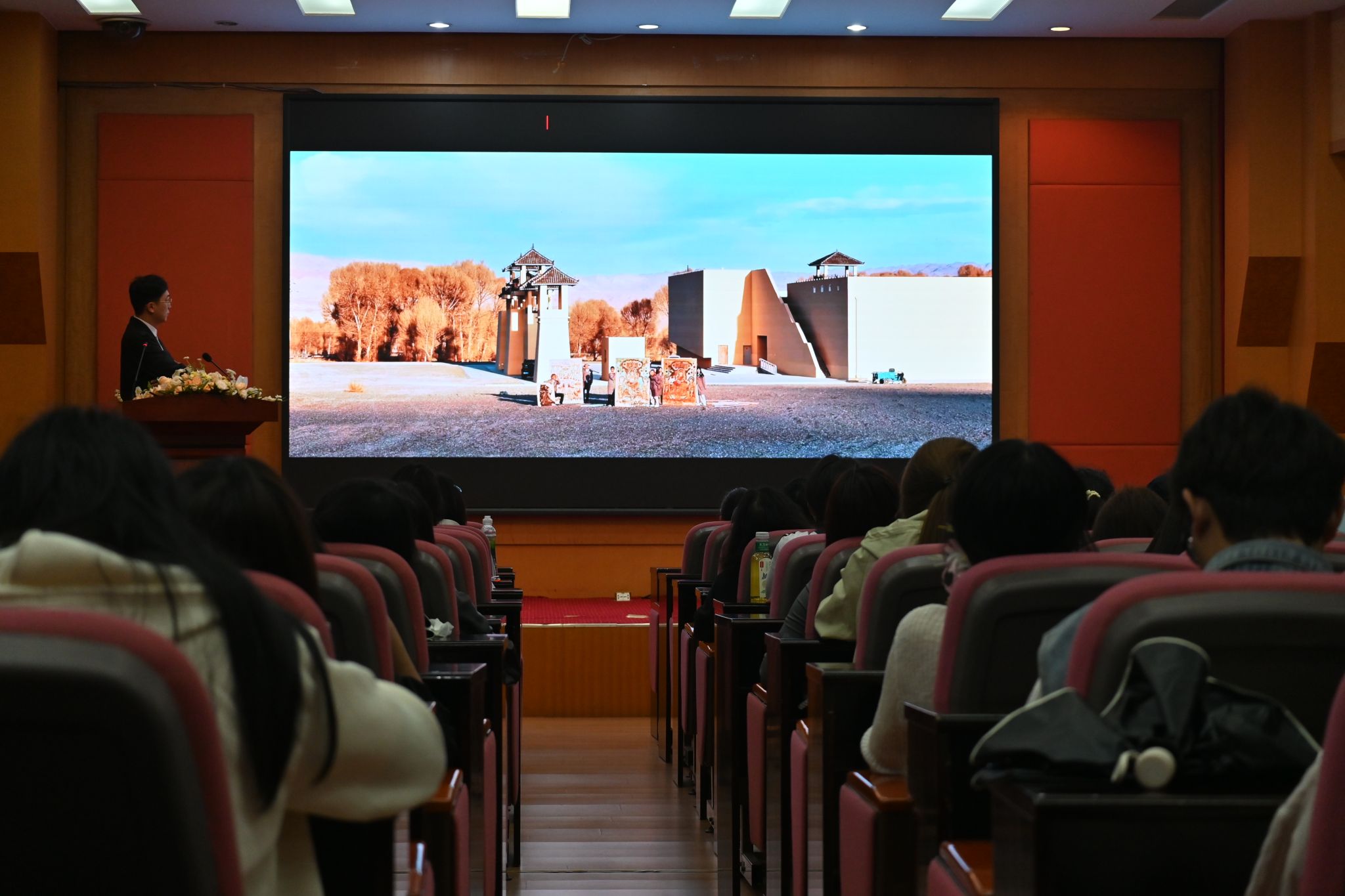 讲座中,刘庆杨以大量高清影像与临摹作品为例,生动展示了壁画色彩褪变、构图修复等技术难点,并揭秘了团队如何通过跨学科协作攻克材料、光影等难题。