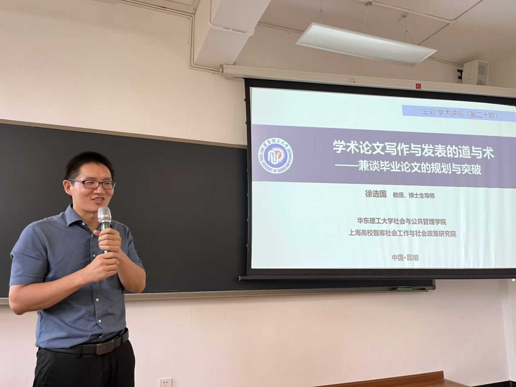 9月23日,学校举办第二十期“云彩”学术讲坛,华东理工大学社会与公共管理学院教授、博士生导师徐选国教授应邀作题为《学术论文写作与发表的道与术——兼谈毕业论文的规划与突破》的专题讲座。讲座由法政学院社会工作硕士点负责人孙国嫄副教授主持,法政学院党委书记舒求及100余名师生参加。