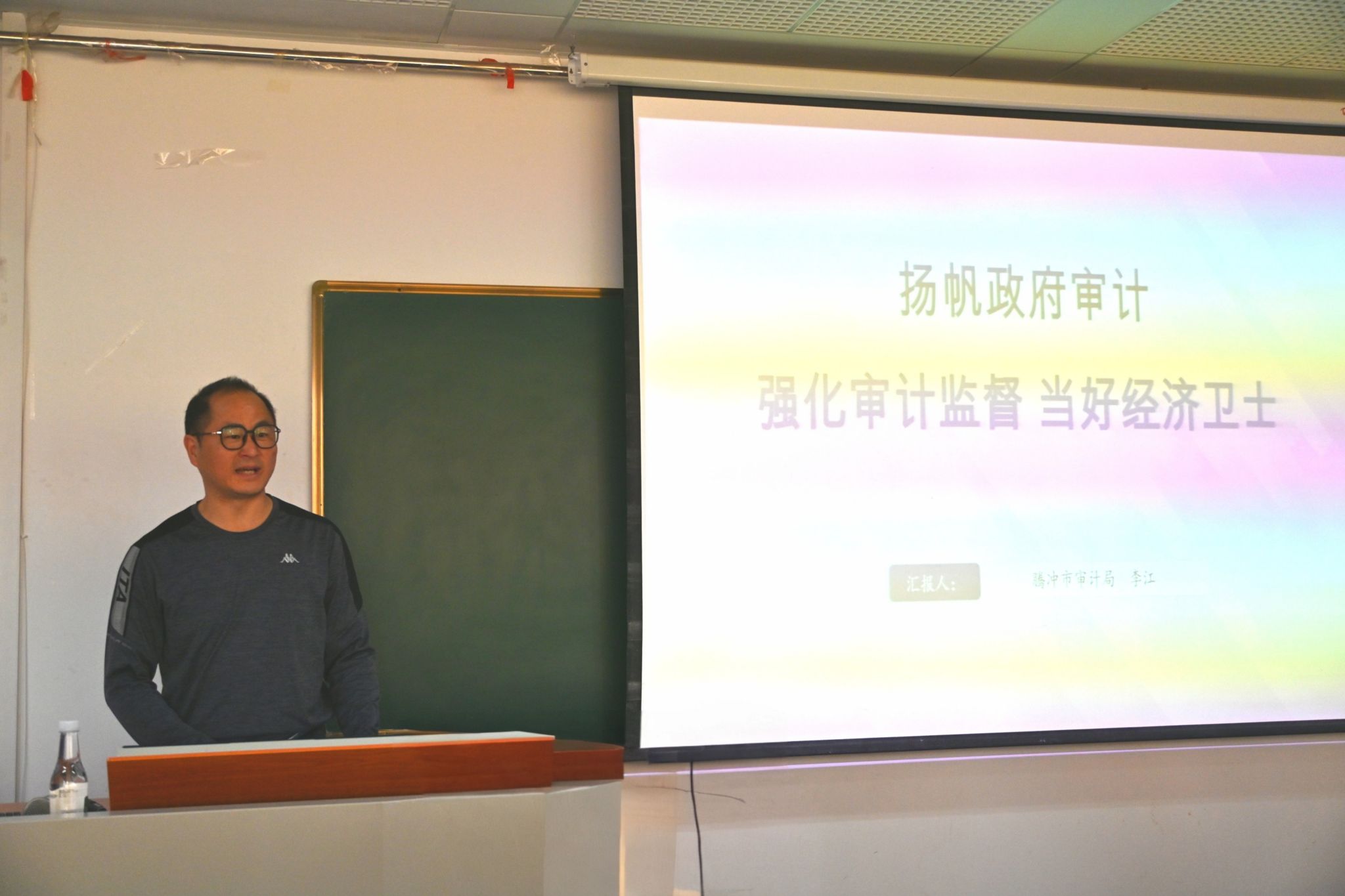 11月14日,云南省审计厅与bat365在线中国官网登录入口的厅校合作项目“政府审计进校园”系列讲座第14期在逸夫楼804举行,原腾冲市审计局副局长、经责办主任、高级审计师李江应邀主讲,讲座由bat365在线中国官网登录入口会计(审计)学院博士生导师朱锦余教授主持,学院100余名师生参加。